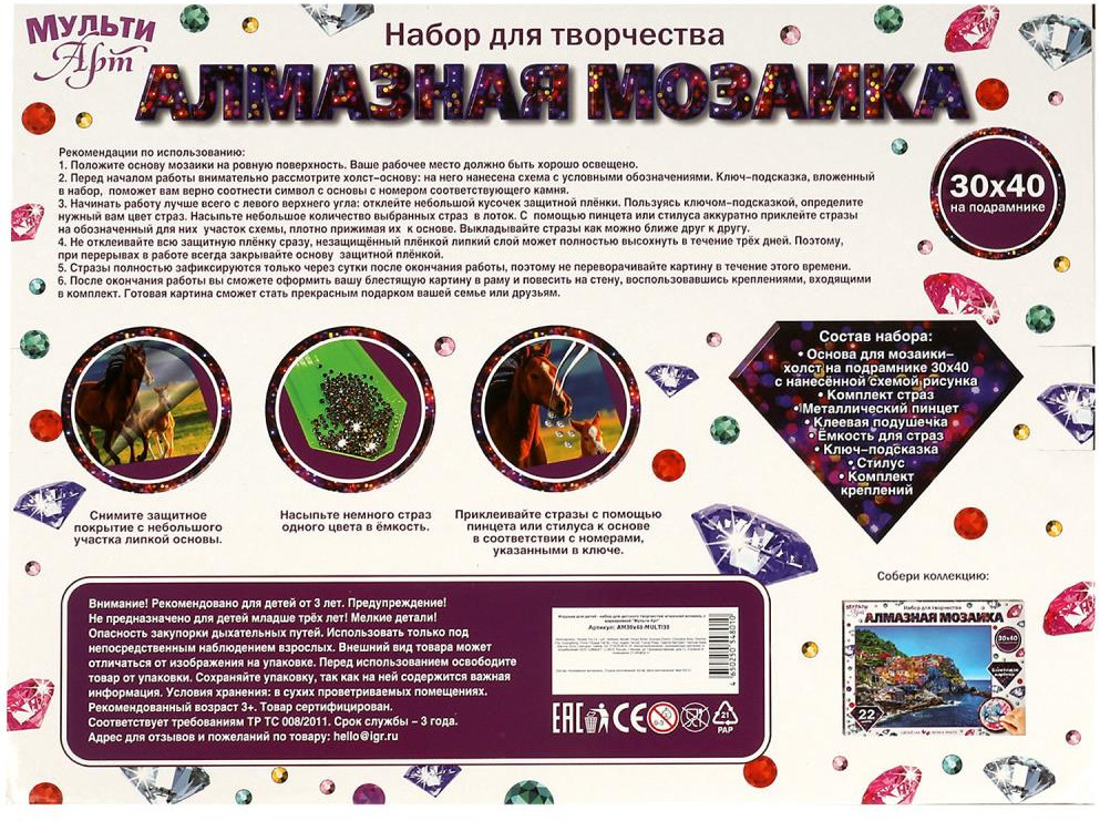 💳 Оплатить за товар можно при получении 🇰🇿 Есть бесплатная доставка по Казахстану 🎁 Копите бонусы с каждой покупки Набор для детского творчества — алмазная мозаика «Лошади» ТМ «Мульти Арт» — отличный подарок для ребёнка, который будет способствовать развитию его творческих способностей. При помощи этого набора маленький художник сможет создать красивую картинку-мозаику, декорированную сверкающими стразами. Яркую блестящую поделку можно подарить близким или использовать для украшения комнаты. |