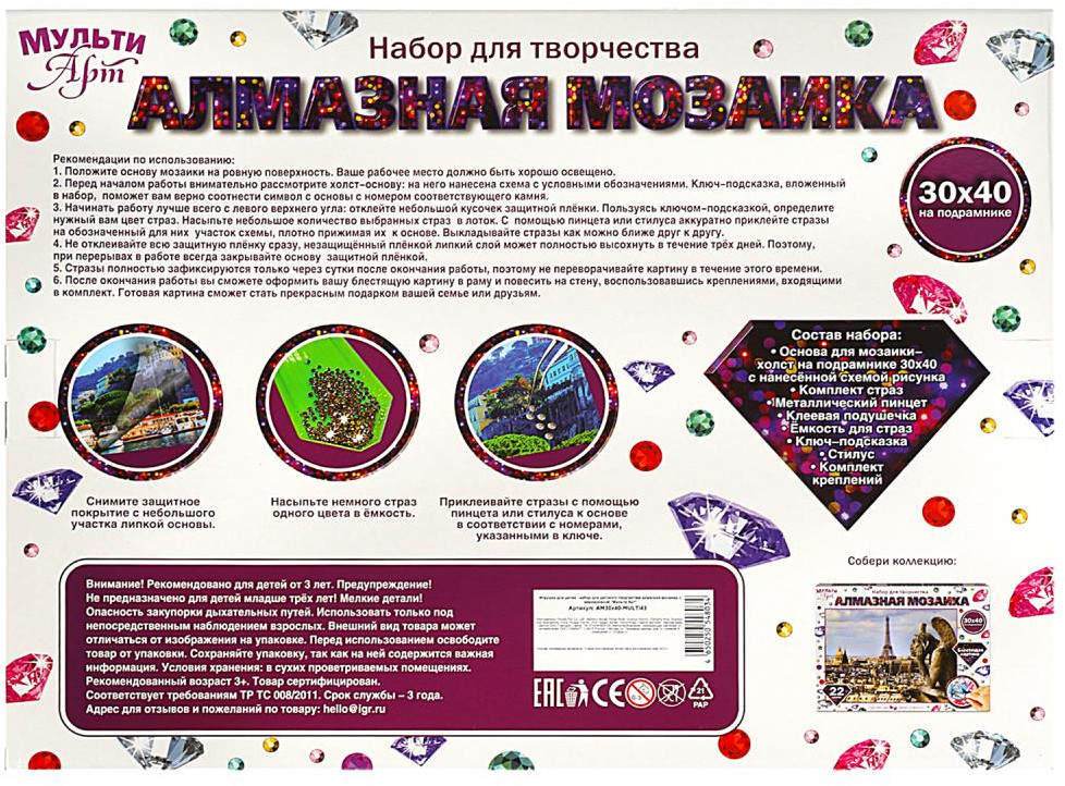 💳 Оплатить за товар можно при получении 🇰🇿 Есть бесплатная доставка по Казахстану 🎁 Копите бонусы с каждой покупки Набор для детского творчества — алмазная мозаика «Монако» ТМ «Мульти Арт» — отличный подарок для ребёнка, который будет способствовать развитию его творческих способностей. При помощи этого набора маленький художник сможет создать красивую картинку-мозаику, декорированную сверкающими стразами. Яркую блестящую поделку можно подарить близким или использовать для украшения комнаты. |