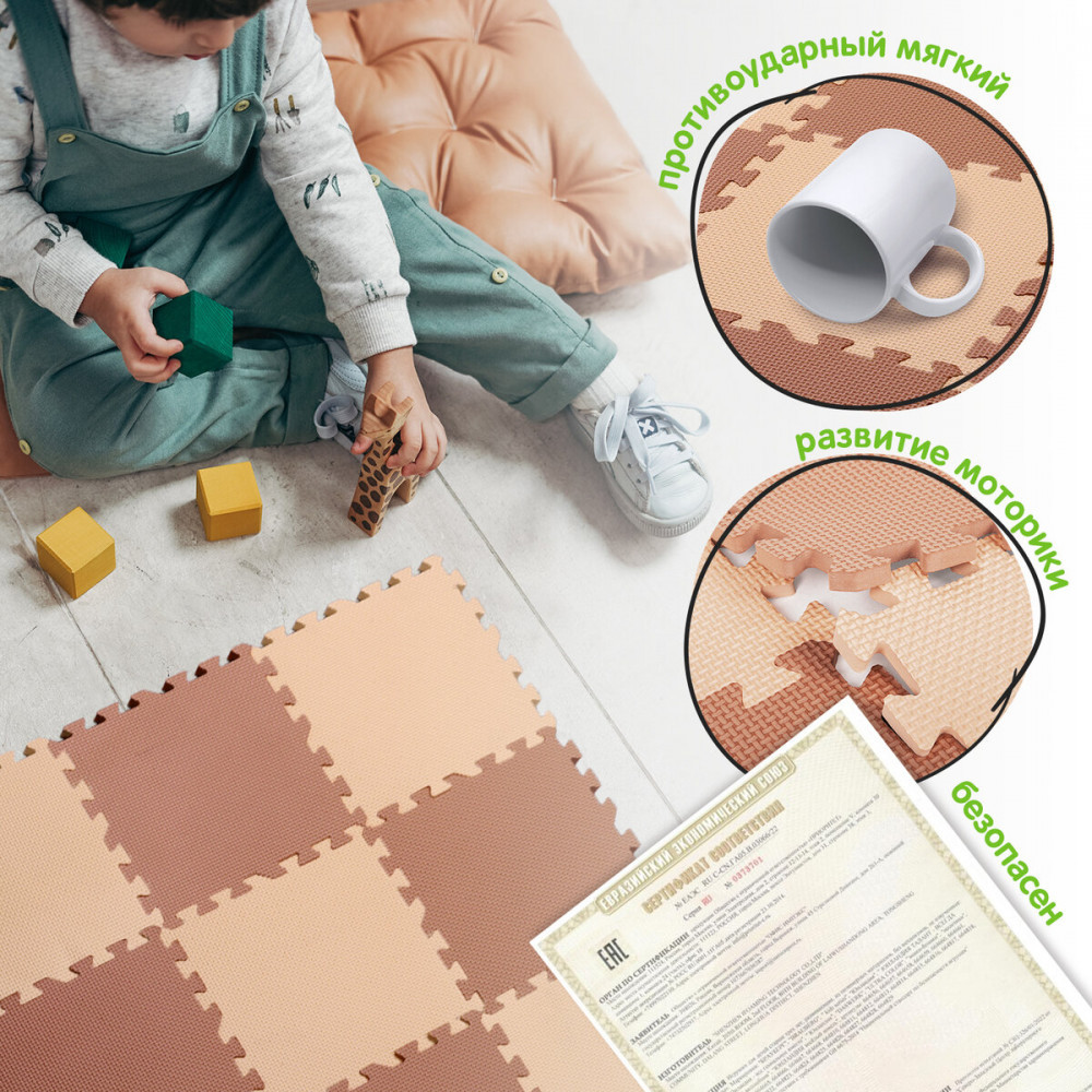 💳 Оплатить за товар можно при получении 🇰🇿 Есть бесплатная доставка по Казахстану от 1 дня 🎁 Копите бонусы с каждой покупки Коврики-пазлы — мягкие коврики, обладающие теплоизоляционными и шумоизоляционными свойствами, изготовленные из безопасного материала. Легко собираются и разбираются, удобны и компактны в хранении. Коврик-пазл состоит из 9 квадратных элементов размерами 30×30 см. Толщина элементов составляет 1 см. Общая площадь — 90×90 см. Коврик включает в себя элементы двух оттенков бежевого цвета. Коврик обладает антискользящим эффектом, смягчает удары при падении. Играть на коврике удобно и тепло. Квадратные элементы легко разбираются и собираются обратно, позволяют строить различные сооружения, способствуя развитию моторики и пространственного мышления. |