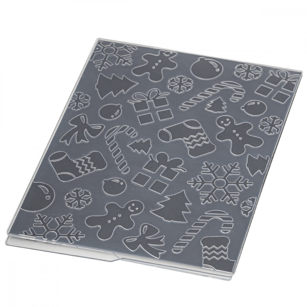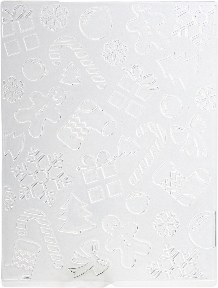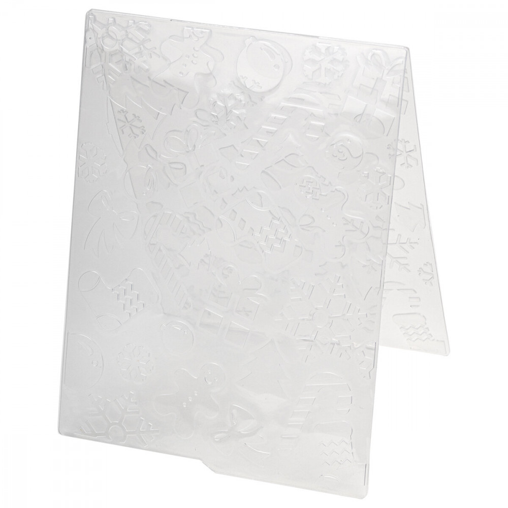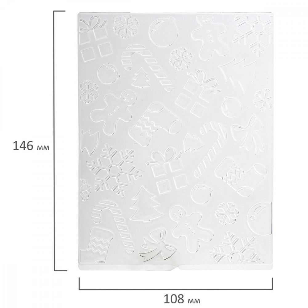 Клише для тиснения — это готовые решения для эмбоссирования и создания эффекта тиснения на любых изделиях из бумаги, картона, фоамирана и других материалов. Используются в скрапбукинге и других видах творчества. Клише для тиснения представляет собой прозрачную папку, сложенную пополам, одна сторона которой имеет выпуклый новогодний фоновый рисунок, а вторая — углубления под него. Размер клише 108 × 146 мм делает его удобным для оформления открыток, страничек скрап-альбомов, приглашений и других неповторимых изделий, созданных в технике скрапбукинга.