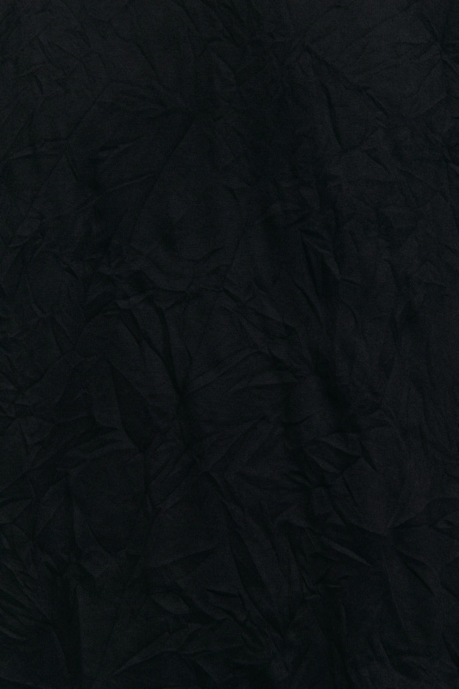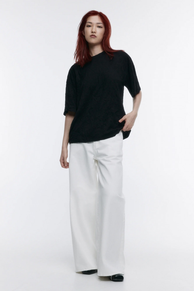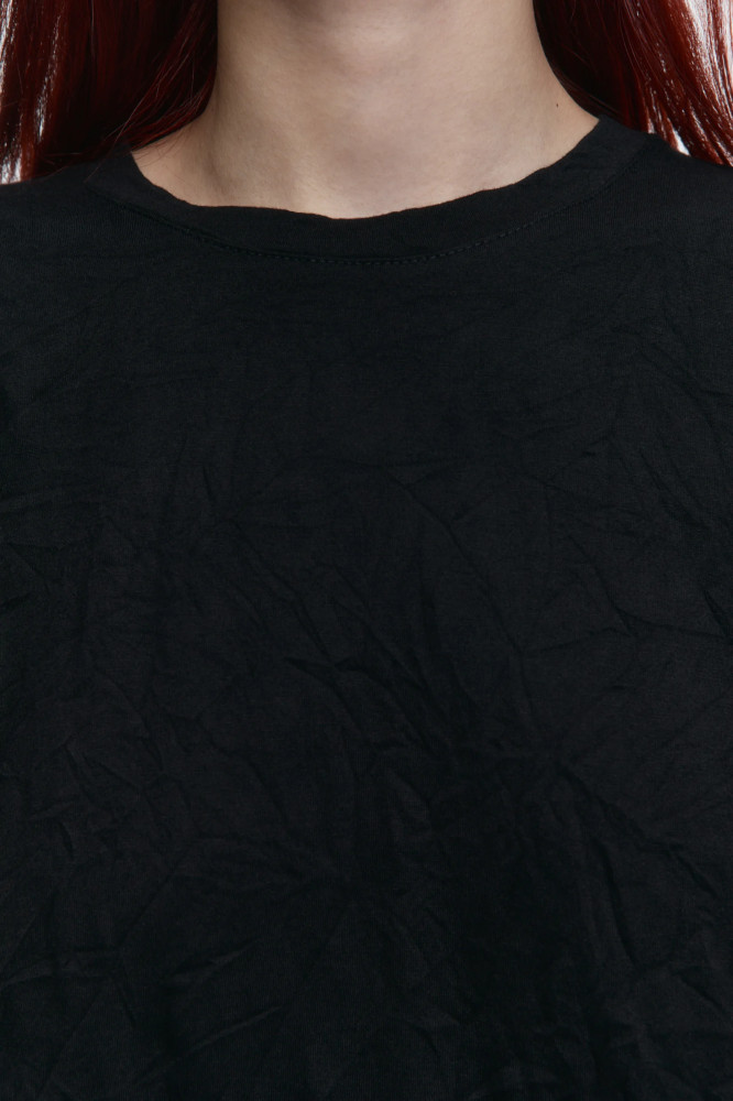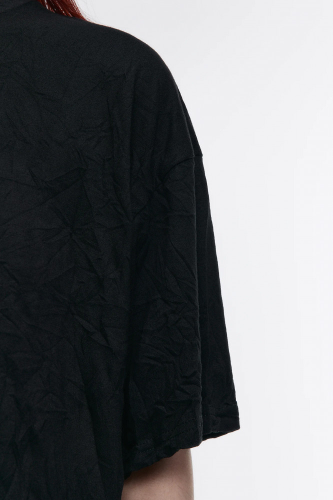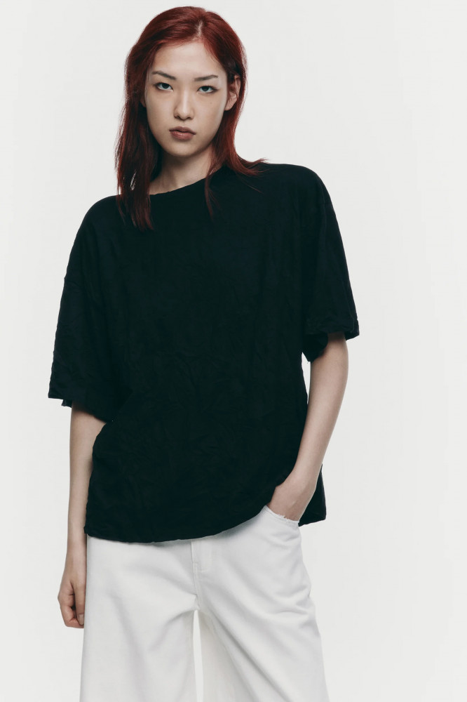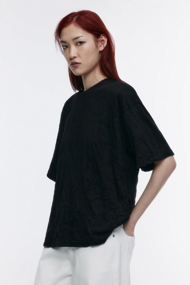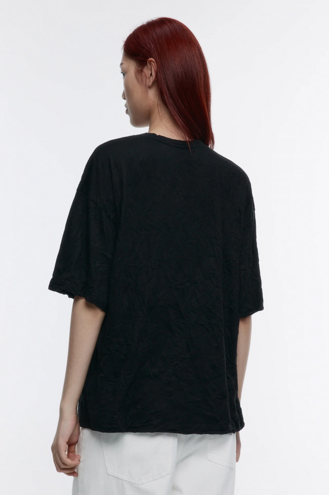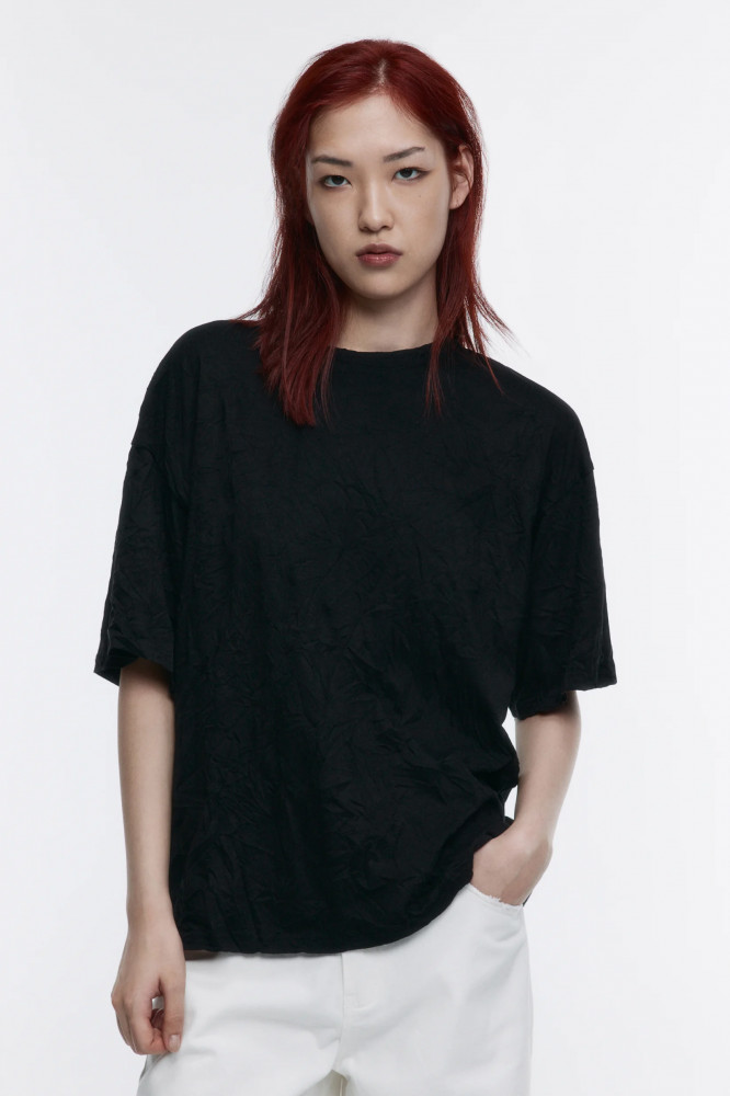 Удлиненная женская футболка кроя oversize из мягкой, мятой и приятной к телу смесовой ткани с добавлением хлопка. Классический круглый вырез горловины без воротника. Удлиненные свободные рукава ниже локтя с прямыми манжетами, спущенная линия плеча. Ткань с трендовым жатым эффектом, которую нельзя гладить и отпаривать (уважительная причина для мамы).