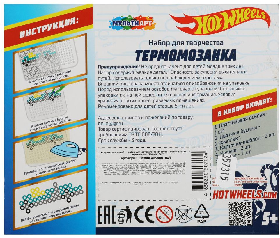 💳 Оплатить за товар можно при получении 🇰🇿 Есть бесплатная доставка по Казахстану от 1 дня 🎁 Копите бонусы с каждой покупки Серия: Hot wheels Набор для детского творчества — термомозаика «Hot Wheels» ТМ «Мульти Арт» — отличный подарок для развития творческих способностей вашего ребёнка.Собирая эту мозаику, маленький творец сможет сложить из цветных бусин 2 вида крутых гоночных машинок. Чтобы зафиксировать рисунок, получившуюся заготовку нужно прогладить утюгом через кальку. После того, как фигурка остынет, её можно будет использовать для декора или в качестве игрушки. |