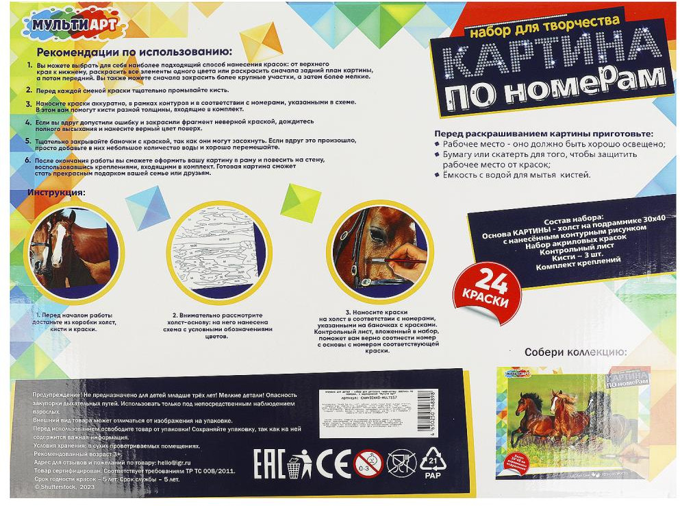 💳 Оплатить за товар можно при получении 🇰🇿 Есть бесплатная доставка по Казахстану от 1 дня 🎁 Копите бонусы с каждой покупки Набор для творчества — картина по номерам «Милые лошади» — отличный подарок для маленького художника. |