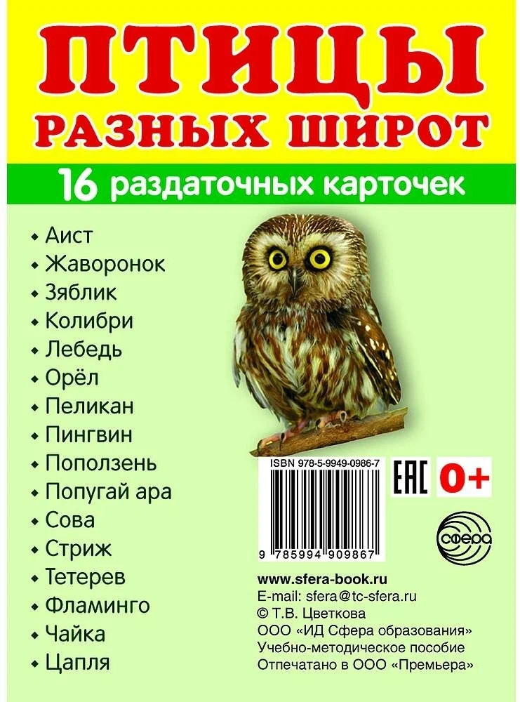 💳 Оплатить за товар можно при получении 🇰🇿 Есть бесплатная доставка по Казахстану от 1 дня 🎁 Копите бонусы с каждой покупки Серия: Демонстрационные картинки 16 раздаточных карточек размером 63 × 87 мм для познавательного и речевого развития. На обратной стороне каждой карточки — название птиц на русском и английском языках. Эти карточки помогут детям изучать разнообразие птиц, развивать речь и расширять кругозор. Список птиц: аист, жаворонок, зяблик, колибри, лебедь, орёл, пеликан, пингвин, поползень, попугай ара, сова, стриж, тетерев, фламинго, чайка, цапля. |