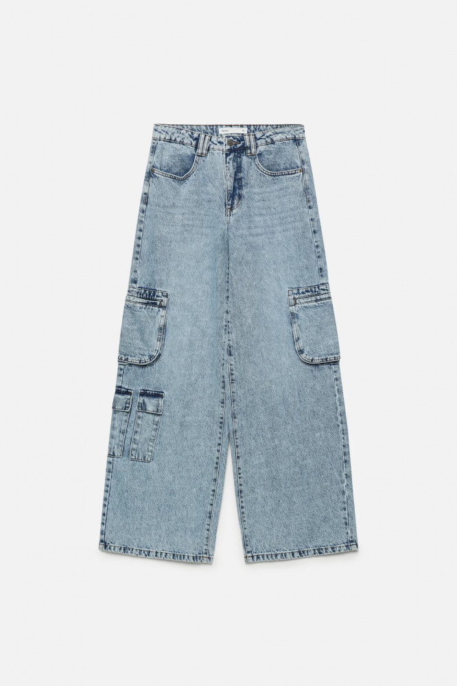Джинсы широкие с карманами карго. Широкие женские джинсы-трубы из плотного 100% хлопкового денима. Стильные и удобные широкие джинсы cargo fit из новой коллекции для расслабленных повседневных и уличных луков с твоими любимыми футболками, свитерами или рубашками. Создавай самые удобные и стильные аутфиты в школу, универ или офис на каждый день с этими трендовыми вареными джинсами-трубами с карманами карго. Сочетай джинсы со свободной джинсовой рубашкой и создавай трендовые денимные тотал-луки.