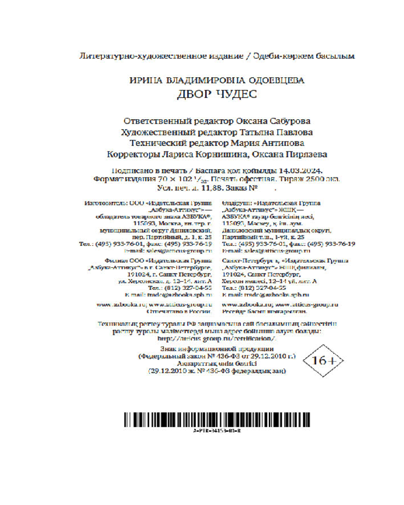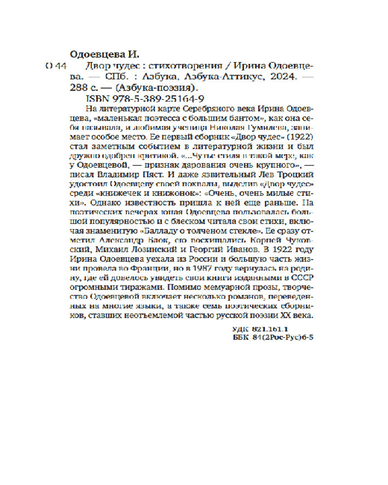 💳 Оплатить за товар можно при получении 🇰🇿 Есть бесплатная доставка по Казахстану от 1 дня 🎁 Копите бонусы с каждой покупки Серия: Азбука-поэзия На литературной карте Серебряного века Ирина Одоевцева, «маленькая поэтесса с большим бантом», как она себя называла, и любимая ученица Николая Гумилева, занимает особое место. Ее первый сборник «Двор чудес» (1922) стал заметным событием в литературной жизни и был дружно одобрен критикой. «...Чутье стиля в такой мере, как у Одоевцевой, — признак дарования очень крупного», — писал Владимир Пяст. И даже язвительный Лев Троцкий удостоил Одоевцеву своей похвалы, выделив «Двор чудес» среди «книжечек и книжонок»: «Очень, очень милые стихи». Однако известность пришла к ней еще раньше. На поэтических вечерах юная Одоевцева пользовалась большой популярностью и с блеском читала свои стихи, включая знаменитую «Балладу о толченом стекле». Ее сразу отметил Александр Блок, ею восхищались Корней Чуковский, Михаил Лозинский и Георгий Иванов. В 1922 году Ирина Одоевцева уехала из России и большую часть жизни провела во Франции, но в 1987 году вернулась на родину, где ей довелось увидеть свои книги изданными в СССР огромными тиражами. Помимо мемуарной прозы, творчество Одоевцевой включает несколько романов, переведенных на многие языки, а также семь поэтических сборников, ставших неотъемлемой частью русской поэзии ХХ века. |