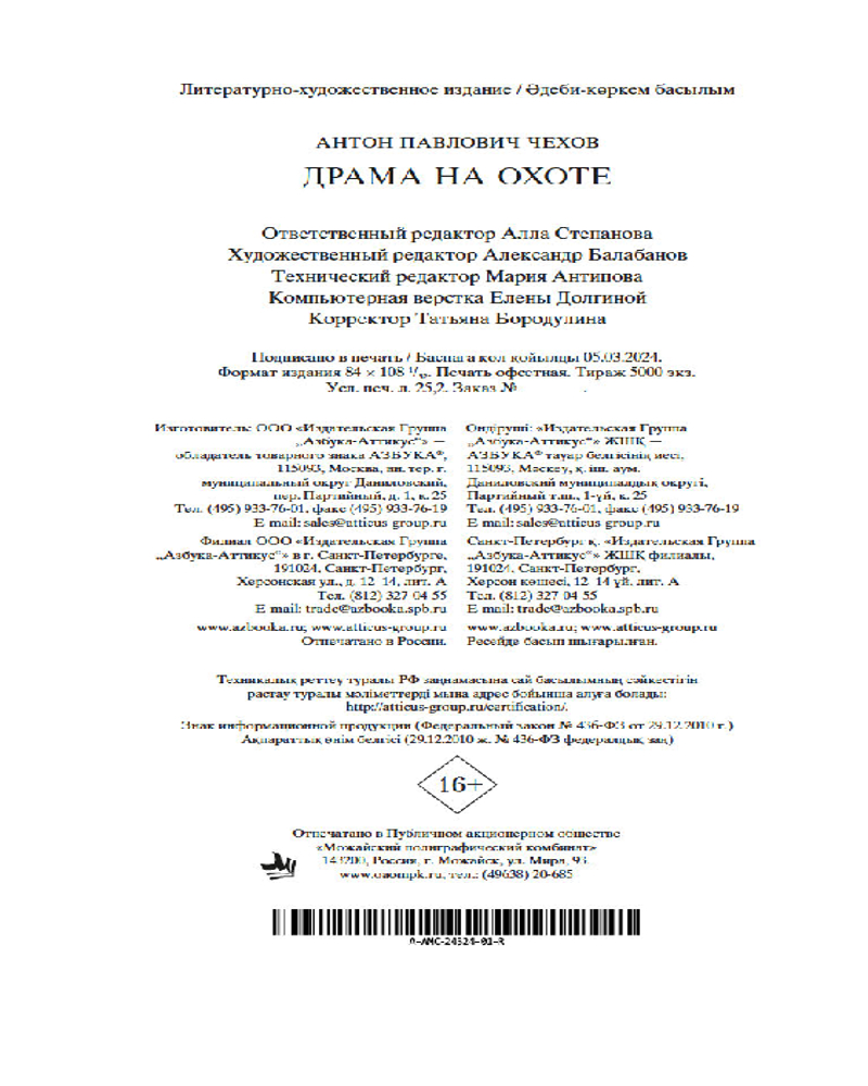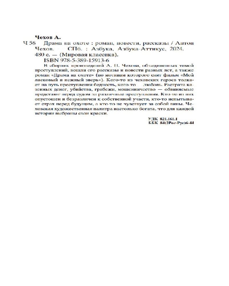 💳 Оплатить за товар можно при получении 🇰🇿 Есть бесплатная доставка по Казахстану от 1 дня 🎁 Копите бонусы с каждой покупки Серия: Мировая классика В сборник произведений А. П. Чехова, объединенных темой преступлений, вошли его рассказы и повести разных лет, а также роман «Драма на охоте» (по мотивам которого снят фильм «Мой ласковый и нежный зверь»). Кого-то из чеховских героев толкает на путь преступления бедность, кого-то — любовь. Растрата казенных денег, убийства, грабежи, мошенничество — обвиняемые предстают перед судом за различные преступления. Кто-то из них опустошен и безразличен к собственной участи, кто-то испытывает страх перед будущим, а кто-то не чувствует за собой вины. Чеховская художественная палитра настолько богата, что для каждой истории выбраны свои краски. |