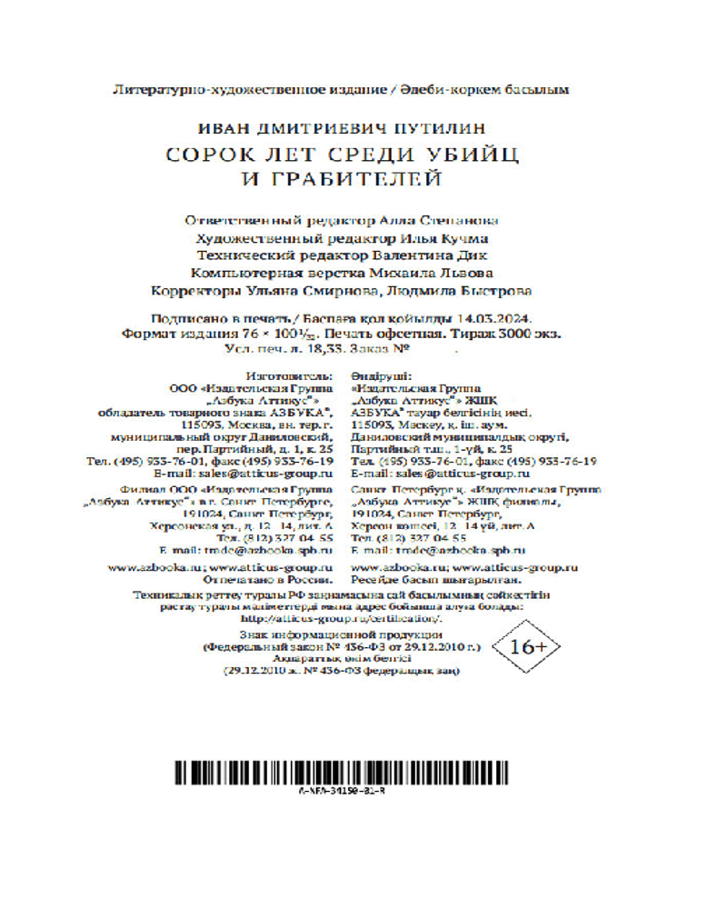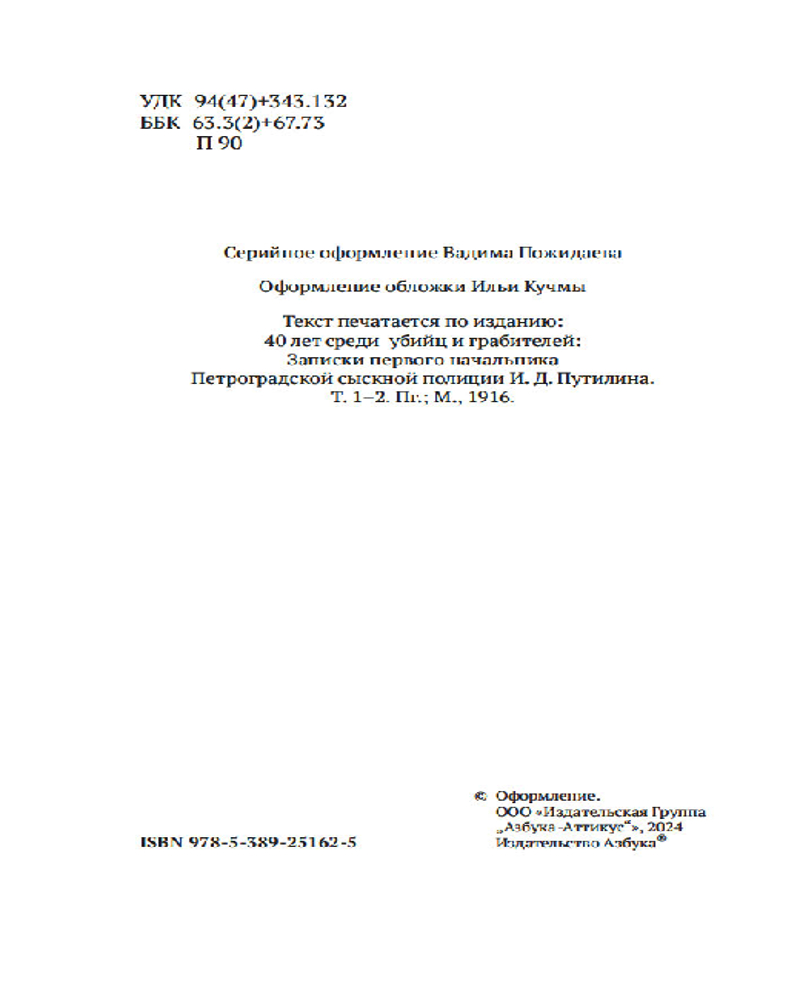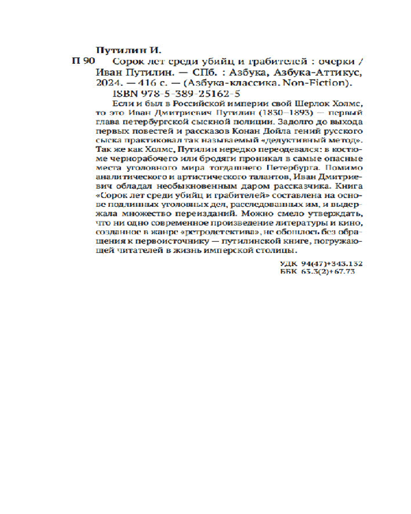 💳 Оплатить за товар можно при получении 🇰🇿 Есть бесплатная доставка по Казахстану от 1 дня 🎁 Копите бонусы с каждой покупки Серия: Азбука-Классика. Non-Fiction Если и был в Российской империи свой Шерлок Холмс, то это Иван Дмитриевич Путилин (1830-1893) — первый глава петербургской сыскной полиции. Задолго до выхода первых повестей и рассказов Конан Дойла гений русского сыска практиковал так называемый «дедуктивный метод». Так же как Холмс, Путилин нередко переодевался: в костюме чернорабочего или бродяги проникал в самые опасные места уголовного мира тогдашнего Петербурга. Помимо аналитического и артистического талантов, Иван Дмитриевич обладал необыкновенным даром рассказчика. Книга «Сорок лет среди убийц и грабителей» составлена на основе подлинных уголовных дел, расследованных им, и выдержала множество переизданий. Можно смело утверждать, что ни одно современное произведение литературы и кино, созданное в жанре «ретродетектива», не обошлось без обращения к первоисточнику — путилинской книге, погружающей читателей в жизнь имперской столицы. |