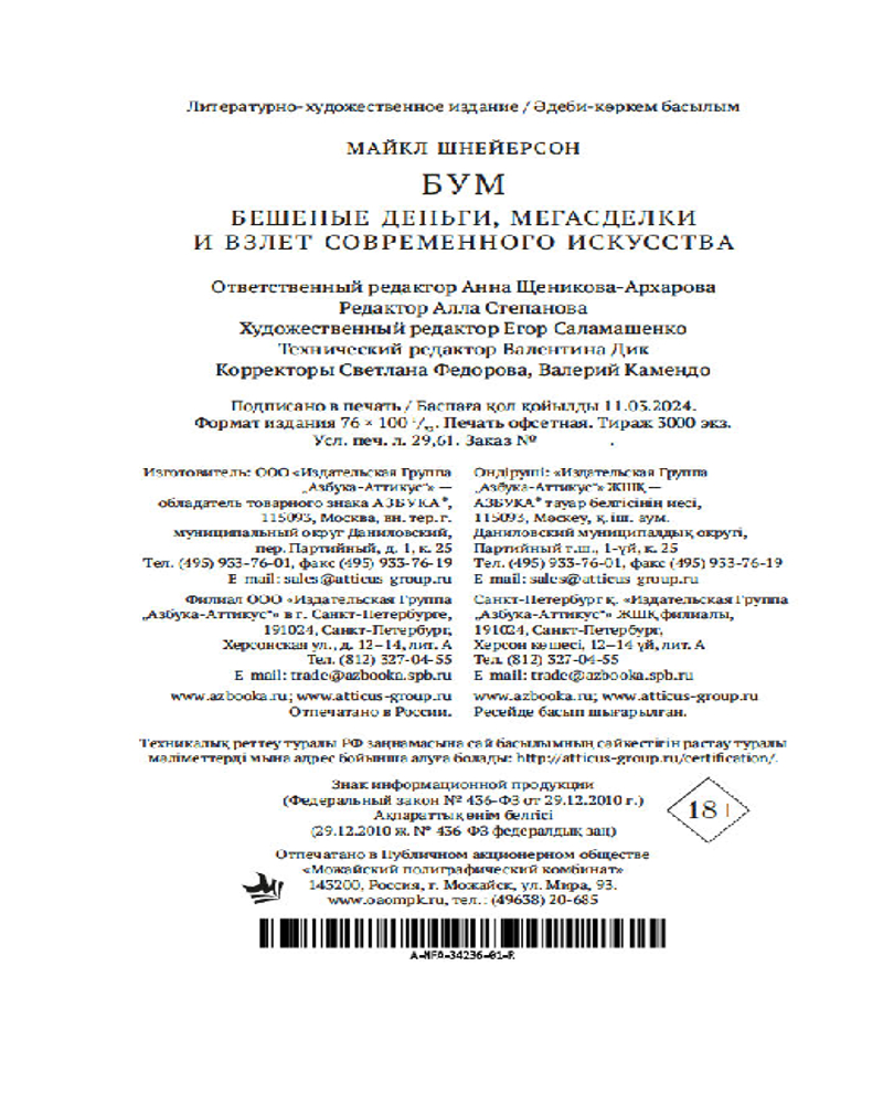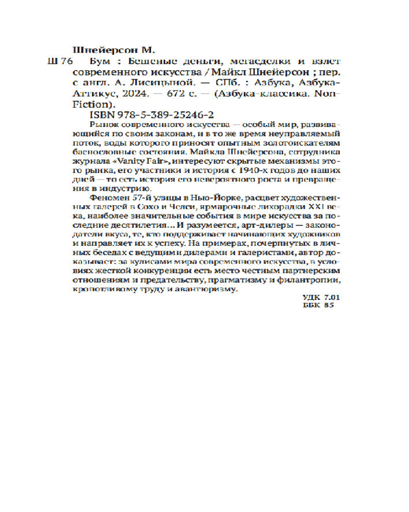 💳 Оплатить за товар можно при получении 🇰🇿 Есть бесплатная доставка по Казахстану от 1 дня 🎁 Копите бонусы с каждой покупки Серия: Азбука-Классика. Non-Fiction Рынок современного искусства — особый мир, развивающийся по своим законам, и в то же время неуправляемый поток, воды которого приносят опытным золотоискателям баснословные состояния. Майкла Шнейерсона, сотрудника журнала «Vanity Fair», интересуют скрытые механизмы этого рынка, его участники и история с 1940-х годов до наших дней — то есть история его невероятного роста и превращения в индустрию. Феномен 57-й улицы в Нью-Йорке, расцвет художественных галерей в Сохо и Челси, ярмарочные лихорадки XXI века, наиболее значительные события в мире искусства за последние десятилетия... И разумеется, арт-дилеры — законодатели вкуса, те, кто поддерживает начинающих художников и направляет их к успеху. На примерах, почерпнутых в личных беседах с ведущими дилерами и галеристами, автор доказывает: за кулисами мира современного искусства, в условиях жесткой конкуренции есть место честным партнерским отношениям и предательству, прагматизму и филантропии, кропотливому труду и авантюризму. |