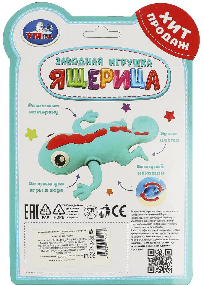 УМка Игрушка заводная «Ящерица»В данный момент этот товар отсутствует в продаже. Возможно, у нас найдется аналогичный или похожий товар здесь. Заводная игрушка для ванной «Ящерица» тм «УМка» непременно позабавит малыша и подарит массу положительных эмоций в процессе игры. Заводная ящерица сделает купание ребёнка весёлым и интересным занятием. Если запустить механизм, она будет быстро плавать, активно двигаясь в воде, что несомненно увлечёт и развеселит малыша. Игра с заводной игрушкой тм «УМка» развивает: мелкую моторику, координацию движений, тактильные навыки и визуальное восприятие. |