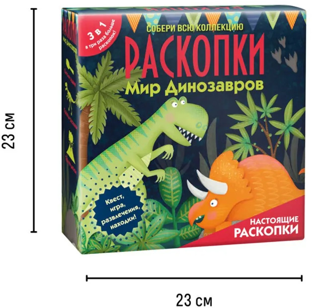 Кроме раскопок путешественник будет исследовать мир динозавров, играя в игру-ходилку, разгадывать таинственные загадки из книги с квестом и раскрашивать открытки, которые можно подарить другим любителям динозавров. В наборе также есть лупа, которая поможет подробно изучить найденных динозавров. Набор для раскопок 3 в 1 – это готовый подарок-приключение, который никого не оставит равнодушным.