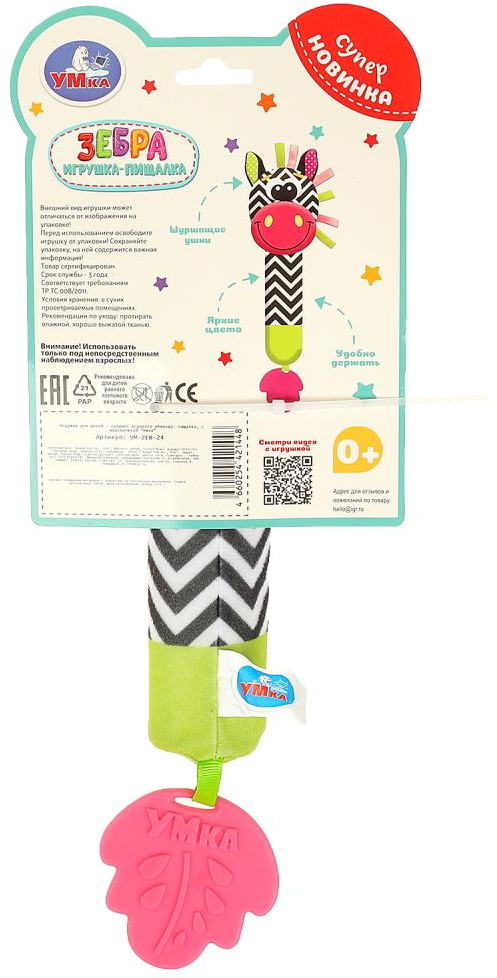 💳 Оплатить за товар можно при получении 🇰🇿 Есть бесплатная доставка по Казахстану от 1 дня 🎁 Копите бонусы с каждой покупки Текстильная игрушка-погремушка с пищалкой «Зебра» ТМ «УМка» разработана специально для самых маленьких. Эта игрушка в виде забавной зебры выполнена из гипоаллергенного разно фактурного текстиля красочной расцветки. При нажатии игрушка издаёт забавный пищащий звук, а если её потрясти - весело загремят шарики, надежно спрятанные внутри. Прорезыватель интересной формы из качественного безопасного материала пригодится малышу, когда у него будут резаться зубки. |