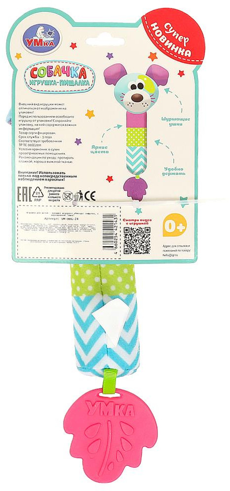 💳 Оплатить за товар можно при получении 🇰🇿 Есть бесплатная доставка по Казахстану от 1 дня 🎁 Копите бонусы с каждой покупки Текстильная игрушка-погремушка с пищалкой «Собачка» ТМ «УМка» разработана специально для самых маленьких. Эта игрушка в виде забавной собачки выполнена из гипоаллергенного разно фактурного текстиля красочной расцветки. При нажатии игрушка издаёт забавный пищащий звук, а если её потрясти - весело загремят шарики, надежно спрятанные внутри. Прорезыватель интересной формы из качественного безопасного материала пригодится малышу, когда у него будут резаться зубки. |