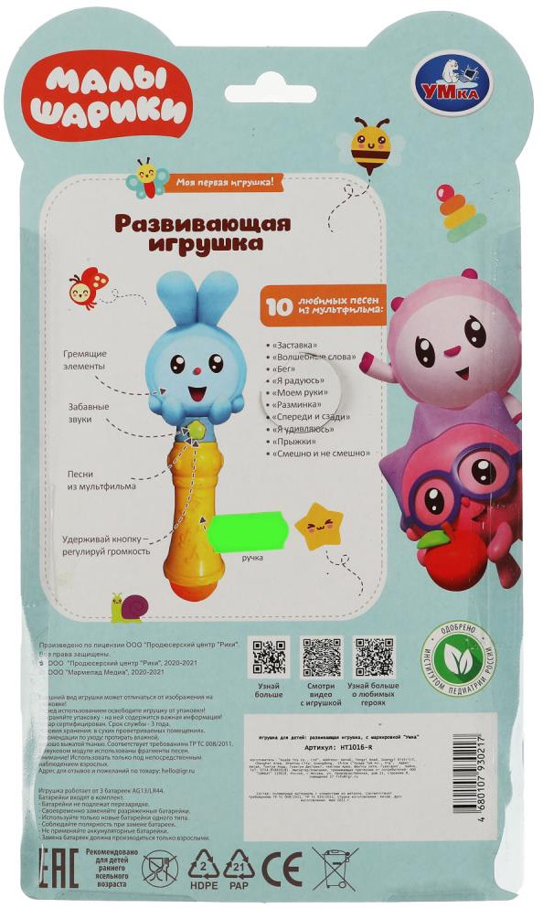 💳 Оплатить за товар можно при получении 🇰🇿 Есть бесплатная доставка по Казахстану от 1 дня 🎁 Копите бонусы с каждой покупки Серия: Малышарики Развивающая игрушка «Малышарики» ТМ «УМка» станет прекрасным подарком для маленьких поклонников одноимённого мультсериала. Яркая игрушка в виде персонажа популярного мультфильма с более 25 песнями и звуками непременно понравится вашему малышу. Ребёнок с удовольствием будет слушать любимые песенки и весёлые звуки. Благодаря ручке, игрушку удобно держать в руках и носить с собой. Музыкальная игрушка ТМ «УМка» способствует развитию: слухового восприятия и музыкального слуха, тактильных навыков, моторики, памяти. |