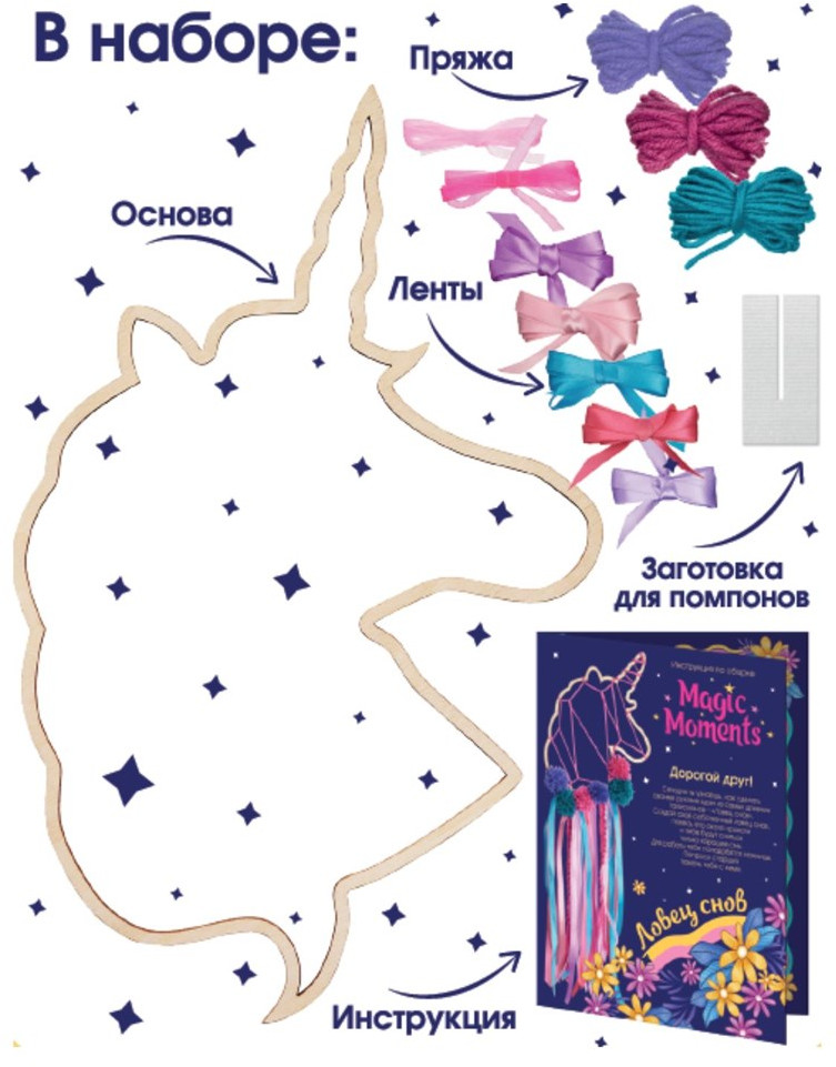 Magic Moments Набор для творчества ловец снов «Единорог»В данный момент этот товар отсутствует в продаже. Возможно, у нас найдется аналогичный или похожий товар здесь. Ловцы снов – это священные амулеты индейцев, которые всегда размещались над кроватью. Считается, что плохие сны запутываются в паутине ловца, а хорошие пролетают сквозь отверстия. А затем по ленточкам внизу хорошие сны спускаются к спящему. Теперь и у вас появилась возможность создать это волшебное украшение для комнаты. Сделайте этот милый ловец снов в форме единорога. Это отличный подарок девочке, которая обожает этих сказочных существ! |