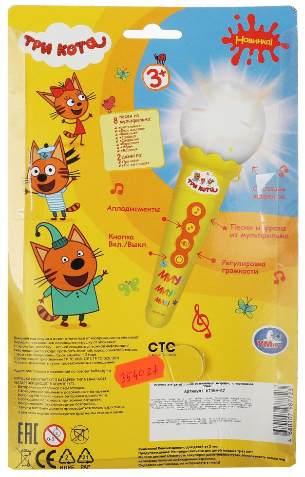 УМка Микрофон музыкальныйВ данный момент этот товар отсутствует в продаже. Возможно, у нас найдется аналогичный или похожий товар здесь. Серия: Три кота Музыкальный микрофон «Три кота» ТМ «УМка» — отличный подарок для маленьких поклонников мультсериала про любознательных котят. Маленькому артисту будет удобно держать в руках этот красочный микрофон. Ребёнок с удовольствием будет слушать весёлые песни, фразы и звуки или выступать самостоятельно, подбадривая себя аплодисментами. |