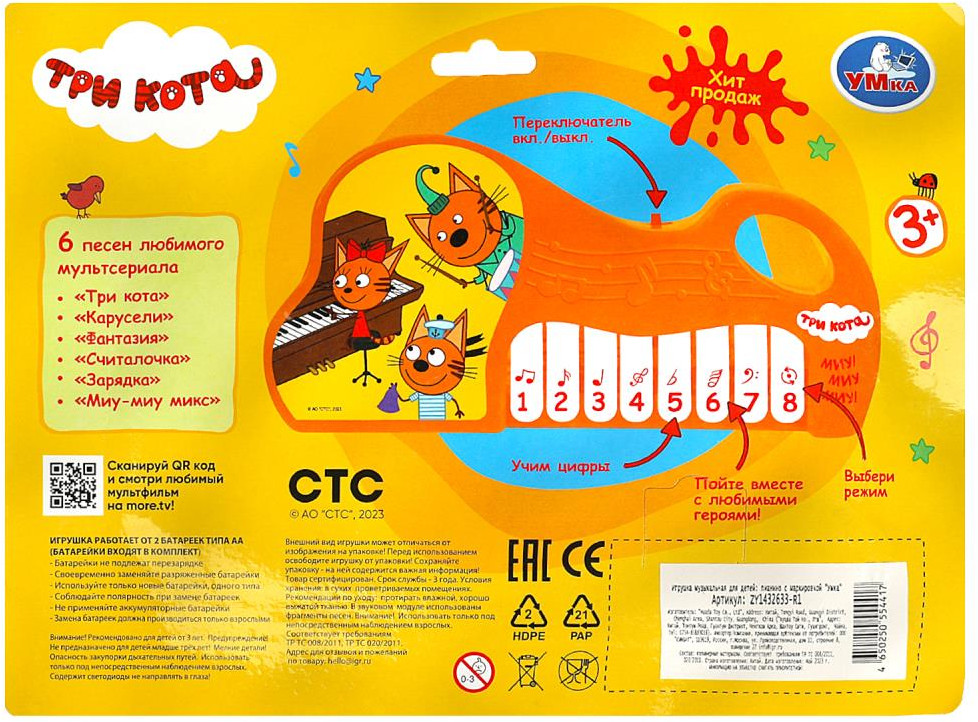 Музыкальное пианино из серии «Три кота» тм «УМка» непременно понравится маленькому поклоннику мультсериала про весёлый трактор и будет способствовать развитию его творческих способностей. Ребёнок с удовольствием будет нажимать на клавиши пианино и слушать весёлые песенки из любимого мультфильма. В увлекательной игровой форме малыш легко выучит цифры. Кроме того, с этой игрушкой можно играть и как с пианино. Игра с электропианино тм «УМка» развивает: слуховые навыки и музыкальный слух, координацию движений, визуальное восприятие и мелкую моторику.