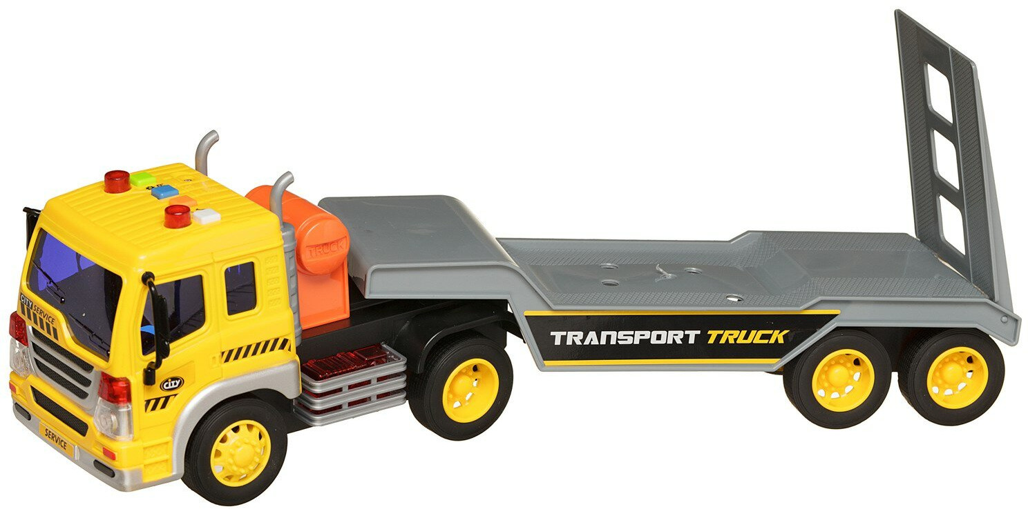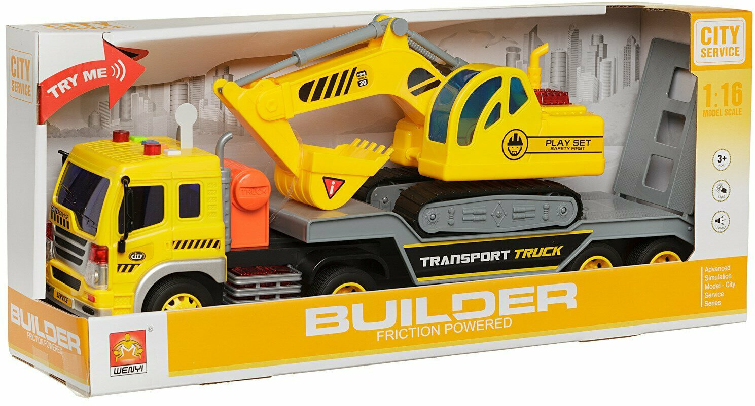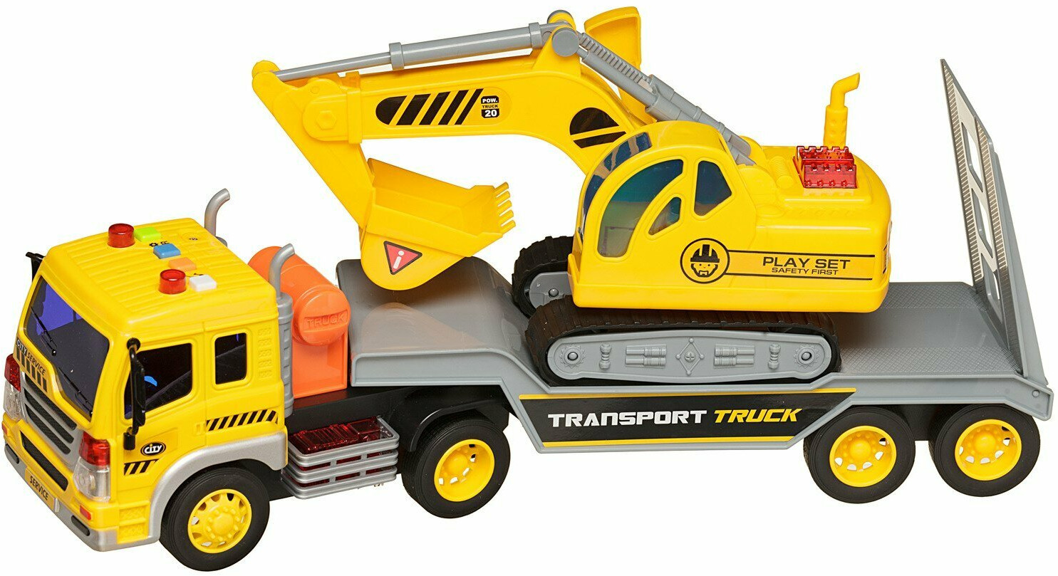 Junfa Toys Набор машин «Эвакуатор с экскаватором»В данный момент этот товар отсутствует в продаже. Возможно, у нас найдется аналогичный или похожий товар здесь. Отличным подарком и прекрасным дополнением коллекции машинок мальчика будет игровой набор «Автовоз-тягач с экскаватором» от бренда Junfa. Машинки имеют реалистичный дизайн. Автовоз оснащен поворотной прицепом-платформой с откидной створкой-трапом. Тягач имеет световые и звуковые эффекты, которые помогут сделать игру ребенка еще интересней и увлекательней. Машинка воспроизводит звуки (сигнал клаксона, запуск двигателя, задний ход), на крыше машины горят проблесковые маячки. На платформе тягача размещен экскаватор с поворотной кабиной и функциональной стрелой. Играя с ним, ребенок сможет провести необходимые копательные работы на своей игрушечной стройке. Интересное времяпрепровождение гарантированы! Машинка «Автовоз-тягач» оснащена фрикционным механизмом. Машинка экскаватора без механизмов. |