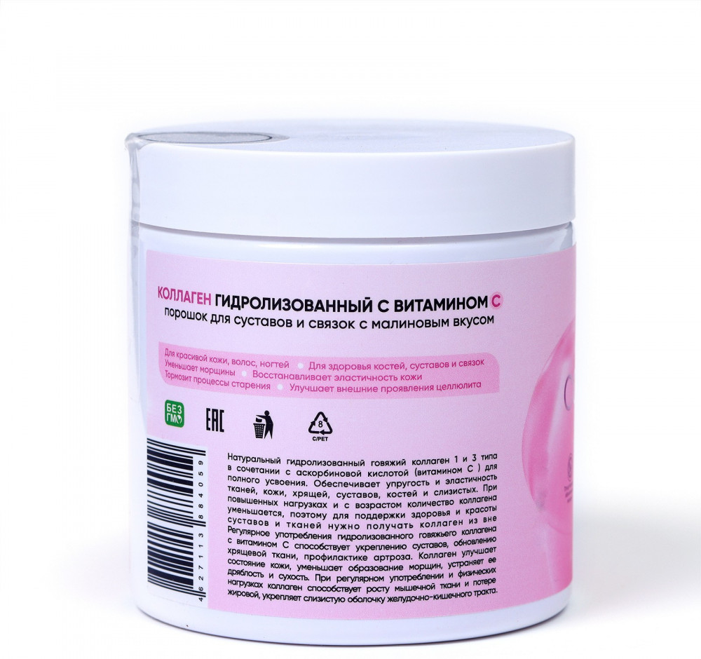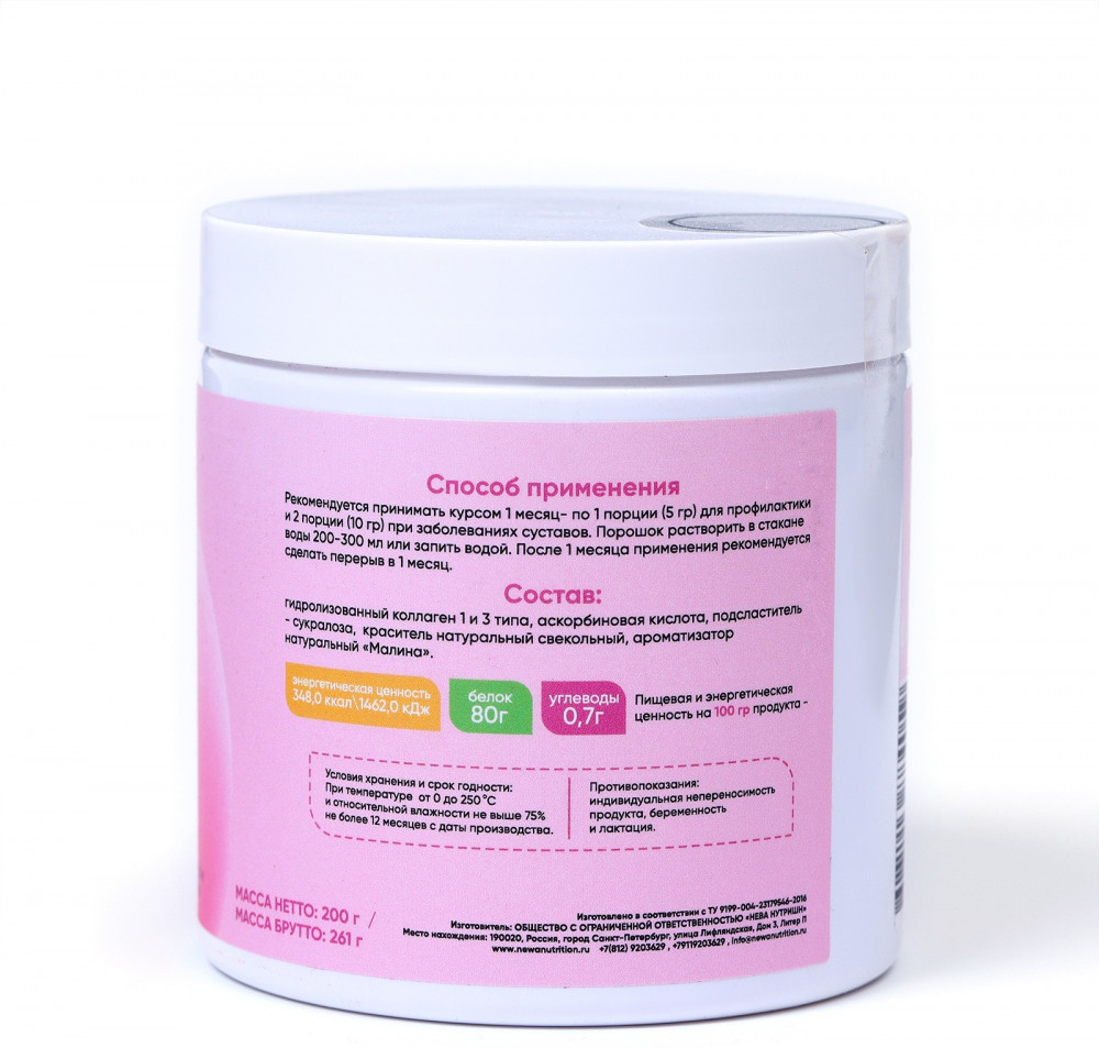 • этот продукт содержит высококачественный гидролизованный коллаген, который легко усваивается организмом. Коллаген — это основной белок, который составляет кожу, суставы, волосы и ногти, и его употребление способствует сохранению их здоровья и красоты;