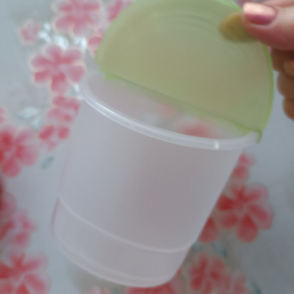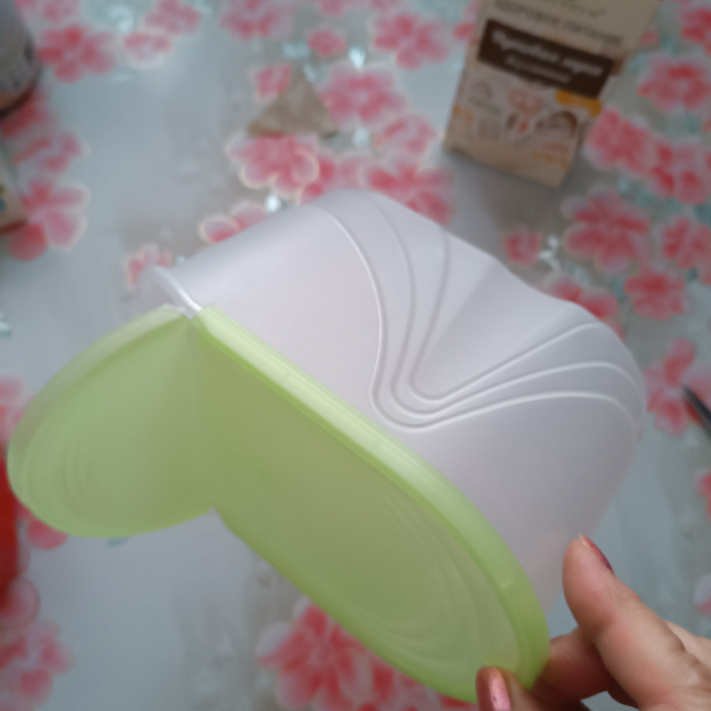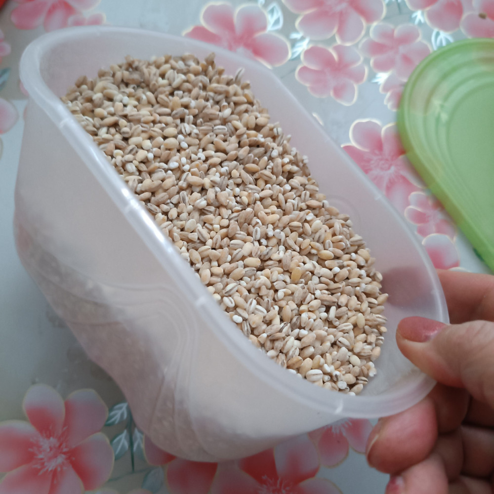 Ёмкость хорошая. Крышка закрывается плотно. Хотелось бы такую же бОльшего размера. Не посмотрела на объём,на килограмм крупы как раз. 800 гр перловки для примера насыпала.