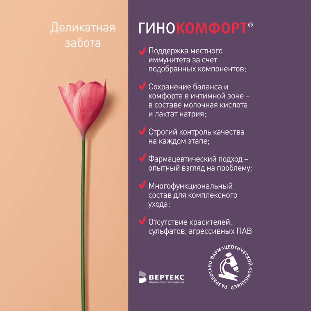 | Бренд Гинокомфорт® разработан российской фармацевтической компанией «Вертекс» для повышения качества жизни женщины. Действие препаратов направлено на быстрое и комплексное устранение проблемы с учетом причин ее возникновения и сопутствующей симптоматики. Средства линейки содержат натуральные компоненты, лечебные свойства которых подтверждены научными исследованиями. |