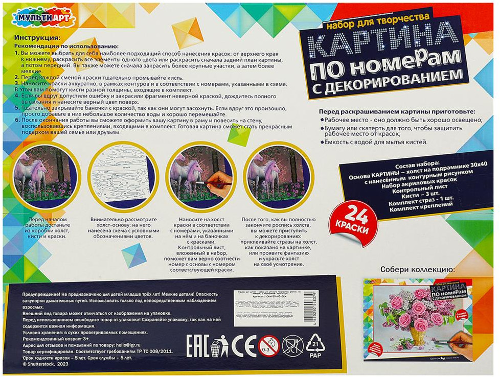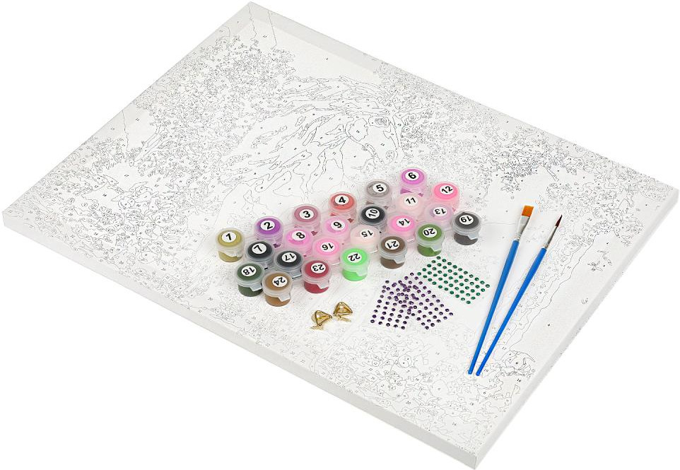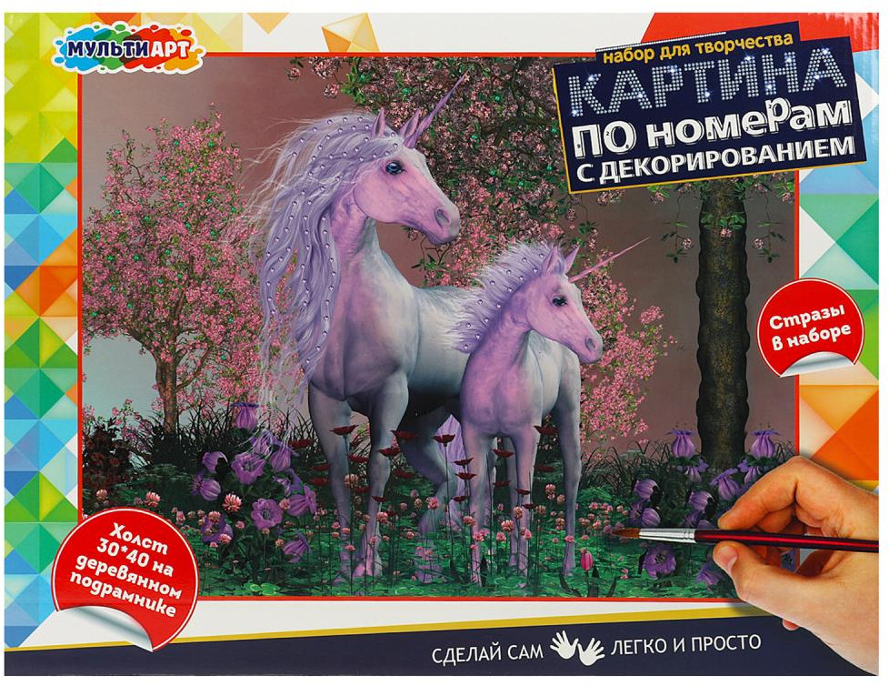 Набор для творчества — картина по номерам с декором «Единороги» ТМ «Мульти Арт» — отличный подарок для маленького художника. Ребёнок увлекательно и с пользой проведёт время, расписывая холст с нанесённой основой и цветовыми подсказками. Готовую картину можно использовать для украшения комнаты или в качестве подарка, сделанного своими руками.
