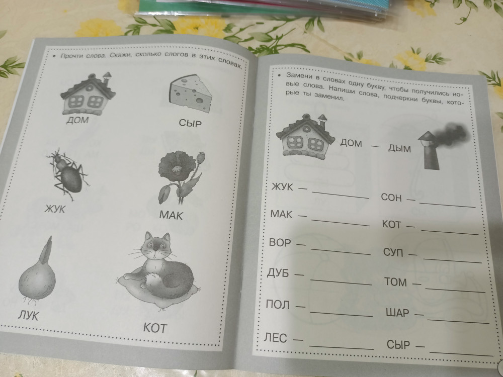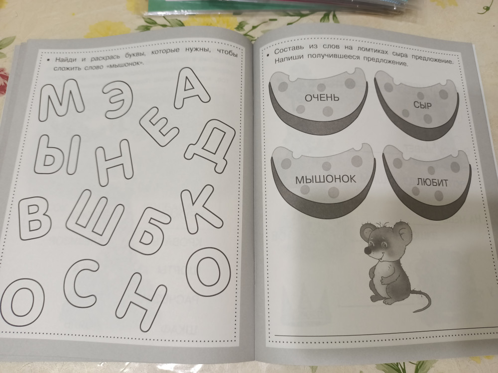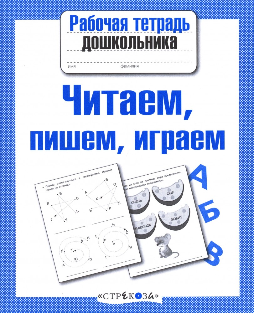 Задания для подготовке к школе, для детей хорошо знакомых с буквами и хоть чуть-чуть умеющих читать. Например, соединить буквы в алфавитном порядке, вписать в клеточки первые буквы названий нарисованных предметов, заменить букву в слове и получить другое слово, соединить слоги, чтобы получились новые слова и т.д. Задания разнообразные, интересные. Тетрадь черно-белая.