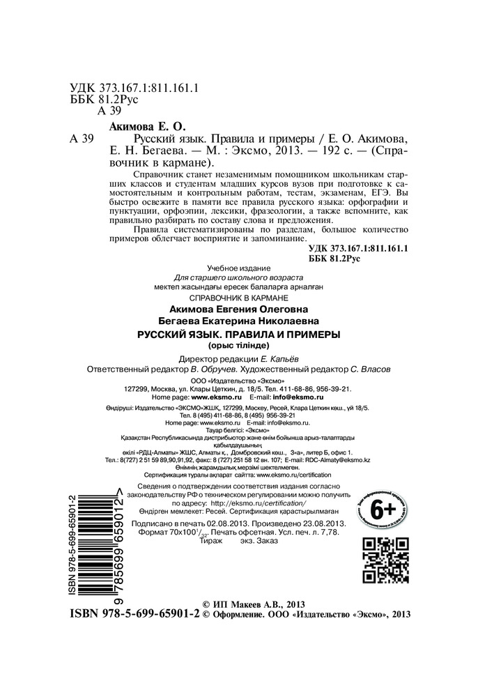 Русский язык. Правила и примерыЕвгения Олеговна Акимова, Екатерина Николаевна Бегаева В данный момент этот товар отсутствует в продаже. Возможно, у нас найдется аналогичный или похожий товар здесь. Серия: Справочник в кармане Справочник станет незаменимым помощником школьникам старших классов и студентам младших курсов вузов при подготовке к самостоятельным и контрольным работам, тестам, экзаменам, ЕГЭ. Вы быстро освежите в памяти все правила русского языка: орфографии и пунктуации, орфоэпии, лексики, фразеологии, а также вспомните, как правильно разбирать по составу слова и предложения. |