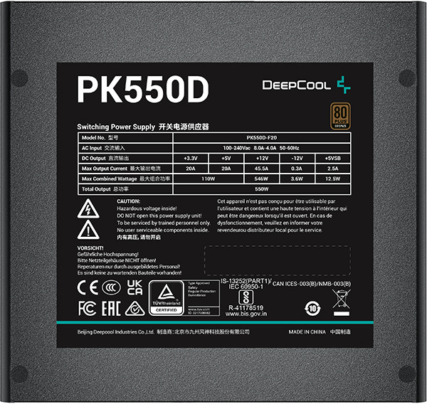 Блок питания DEEPCOOL PK550D [R-PK550D-FA0B-EU] соответствует сертификации 80+ Bronze, имеет высокий уровень эффективности и обеспечивает стабильную работу. В охлаждения используется вентилятор 120 мм, который вращается в автоматическом режиме. Съемные кабели позволяют оптимизировать пространство внутри системного блока и навести порядок.