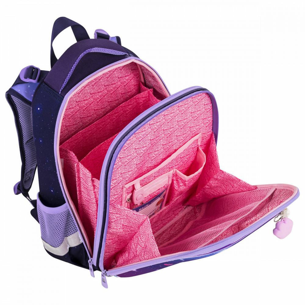 Съёмные нагрудные ремешки помогают равномерно распределять нагрузку на спину. Удобная мягкая вентилируемая спинка с воздушными спонжевыми панелями разработана с учетом анатомических особенностей детей младшего школьного возраста. При правильной регулировке ранец будет практически не ощущаться на плечах и не будет доставлять дискомфорт при носке. В процессе эксплуатации равномерное распределение нагрузки позволит сохранить правильную осанку! В основном отделении ранца можно легко и быстро разместить учебники и тетради между двумя плотными перегородками. Внутри фронтального отделения находится органайзер для канцтоваров, именная карточка, карман для телефона, съёмный карабин для ключей и большое отделение из сетки. Такая организация пространства поможет держать принадлежности в сохранности и приучить ребенка к порядку. Ранец широко раскрывается, повышая удобство использования, а за счёт боковых перегородок содержимое не выскользнет из ранца.