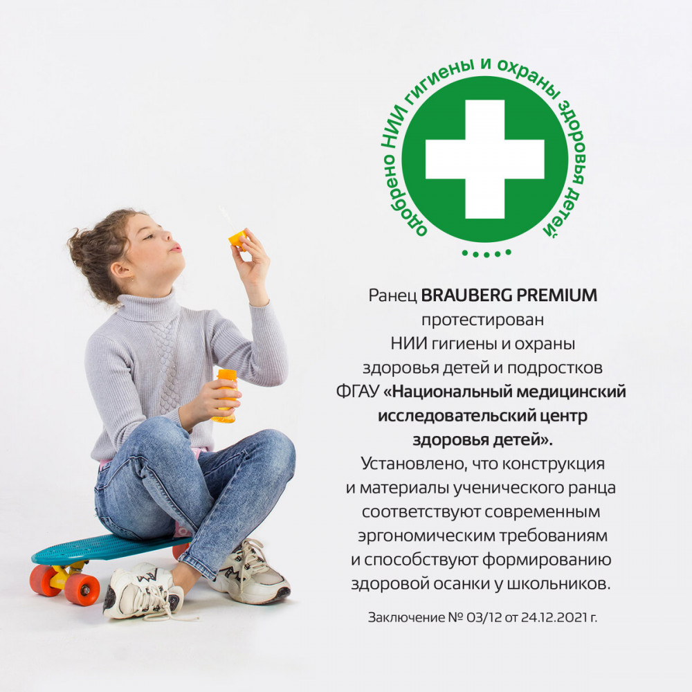 Серия: Premium Ранец Brauberg серии Premium — самой популярной капсульной формы среди ранцев. Изготовлен из легкого, формоустойчивого, экологичного материала EVA с качественной и яркой печатью и различными эффектами. В комплекте с ранцем поставляется брелок-подвеска. Ранцы Brauberg Premium протестированы НИИ гигиены и охраны здоровья детей и подростков ФГАУ «Национальный медицинский исследовательский центр здоровья детей». В рамках проведенных исследований было установлено, что конструкции и материалы ученических ранцев соответствуют современным эргономическим требованиям и способствуют формированию здоровой осанки у школьников.