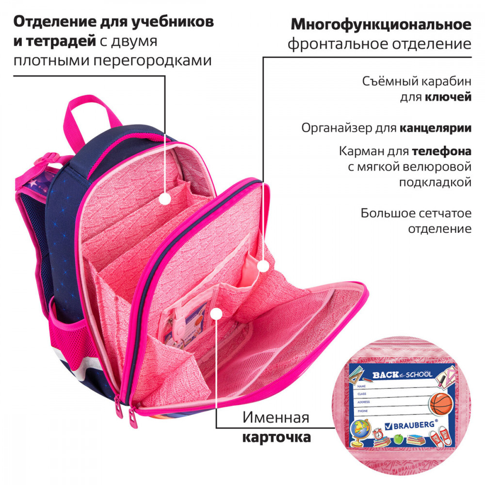 Съёмные нагрудные ремешки помогают равномерно распределять нагрузку на спину. Удобная мягкая вентилируемая спинка с воздушными спонжевыми панелями разработана с учетом анатомических особенностей детей младшего школьного возраста. При правильной регулировке ранец будет практически не ощущаться на плечах и не будет доставлять дискомфорт при носке. В процессе эксплуатации равномерное распределение нагрузки позволит сохранить правильную осанку! В основном отделении ранца можно легко и быстро разместить учебники и тетради между двумя плотными перегородками. Внутри фронтального отделения находится органайзер для канцтоваров, именная карточка, карман для телефона, съёмный карабин для ключей и большое отделение из сетки. Такая организация пространства поможет держать принадлежности в сохранности и приучить ребенка к порядку. Ранец широко раскрывается, повышая удобство использования, а за счёт боковых перегородок содержимое не выскользнет из ранца.