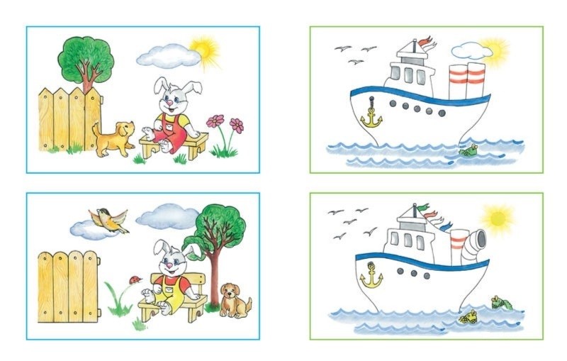Задания на развитие внимания. Раньше ребенку было сложно понять, чем отличаются картинки, но благодаря таким ярким и крупным картинкам, щелкаем за раз! По 2 рисунка на каждой странице, от 5 до 12 отличий!