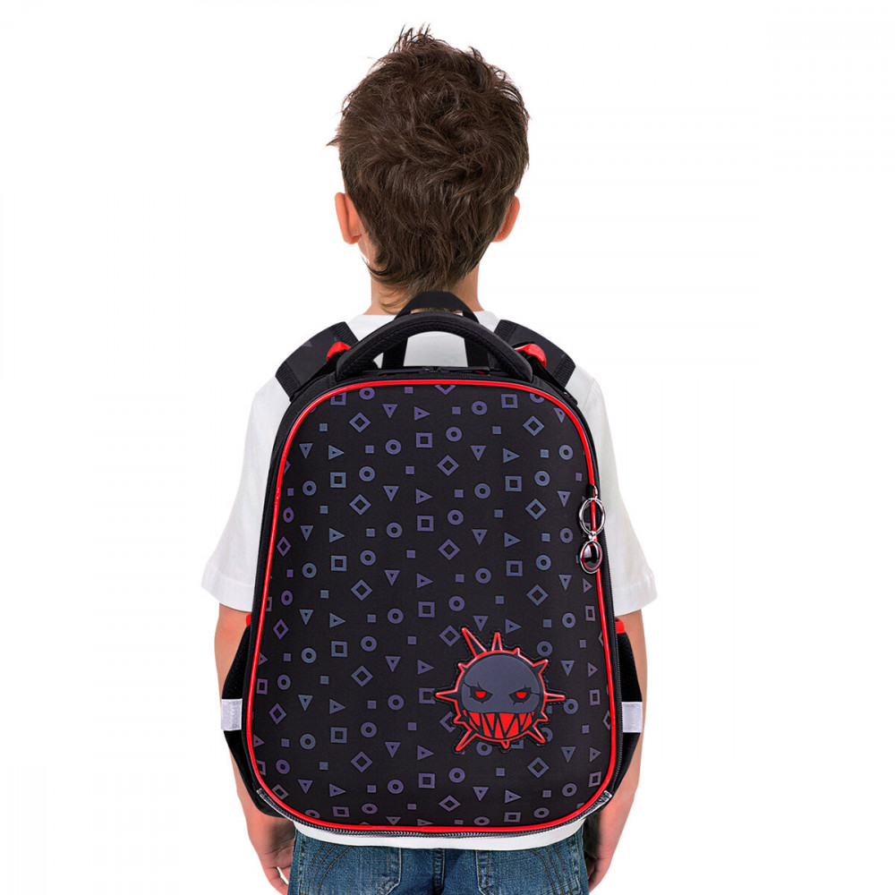 Дизайн передней панели ранца реализован с использованием уникального светоотражающего принта: при попадании искусственного света ранец переливается разноцветным свечением, тем самым привлекая внимание и повышая безопасность ребенка в темное время суток. Аппликация из экокожи на передней панели и оригинальный брелок дополняют дизайн ранца.