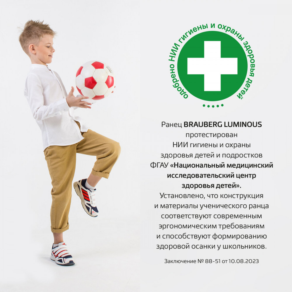 Ранцы Brauberg серии Luminous протестированы НИИ гигиены и охраны здоровья детей и подростков ФГАУ «Национальный медицинский исследовательский центр здоровья детей». В рамках проведенных исследований* было установлено, что конструкции и материалы ученических ранцев соответствуют современным эргономическим требованиям и способствуют формированию здоровой осанки у школьников.