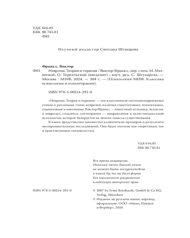 Неврозы. Теория и терапияВ данный момент этот товар отсутствует в продаже. Возможно, у нас найдется аналогичный или похожий товар здесь. Серия: Психология МИФ. Классика психологии Практическое руководство по преодолению неврозов и глубокое философское размышление о природе человеческого существования и необходимости нахождения смысла в жизни. От психиатра и доктора медицины Виктора Франкла. Руководство, претерпевшее уже 9 переизданий, представляет собой важное творение, в котором Франкл подробно рассматривает соматогенные, психогенные, социогенные и ноогенные неврозы, разъясняет причины их возникновения и показывает, как с помощью логотерапии преодолеть невротические состояния и снова найти смысл. |