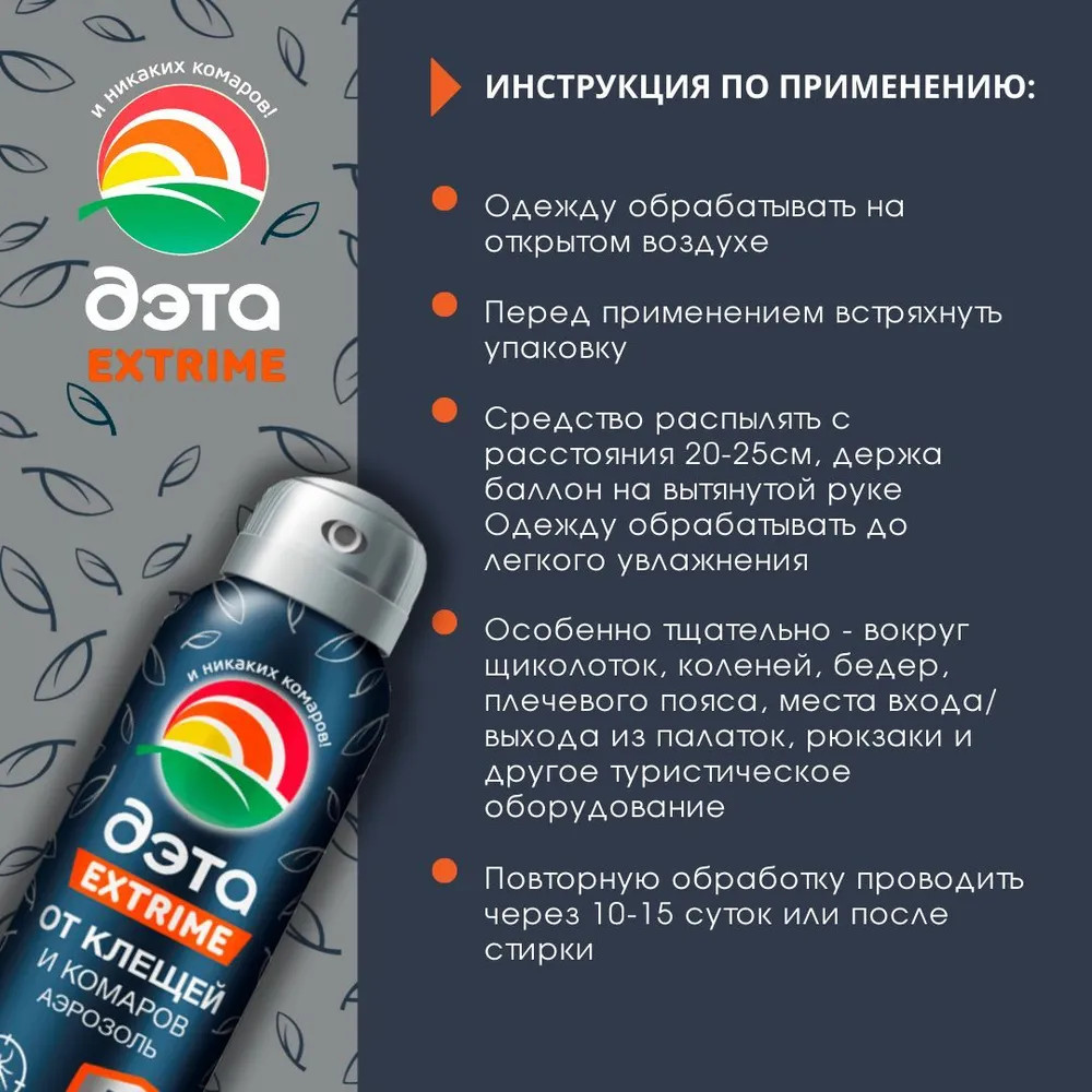 💳 Оплатить за товар можно при получении 🇰🇿 Есть бесплатная доставка по Казахстану 🎁 Копите бонусы с каждой покупки Аэрозоль Дэта — это средство от всех летающих насекомых и клещей для применения на открытом воздухе. Отпугивает кровососущих насекомых и паразитов с помощью запаха. Средство подходит для применения весной и летом. |