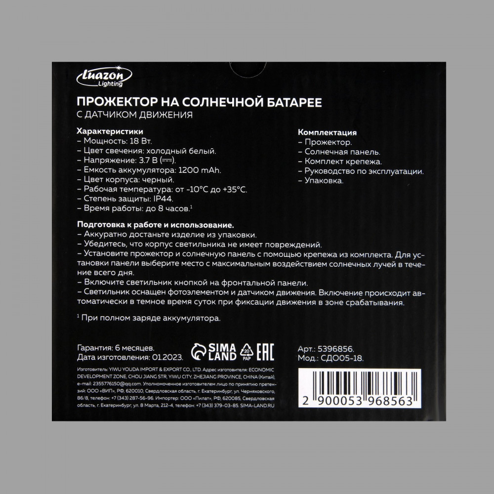 Luazon Lighting Прожектор на солнечной батарее светодиодныйВ данный момент этот товар отсутствует в продаже. Возможно, у нас найдется аналогичный или похожий товар здесь. Прожектор на солнечной батарее с отдельной выносной солнечной панелью обеспечит автономное освещение как снаружи, так и внутри помещения. Светодиодный солнечный прожектор идеально подходит для освещения помещений, террас, беседок, садов, лестниц, въездных ворот, парковок и площадей. Излучает яркий приятный свет, простой в установке, работает от встроенного аккумулятора, который может подзаряжаться днем от солнечной батареи. Несмотря на свои небольшие размеры этот осветительный прибор способен излучать яркий поток света. Хорошо защищен от дождя и холода, но рекомендуем ставить под козырьком. Он также укрепит уровень безопасности вашего домовладения. Даже при непрерывном освещении он способен проработать от батареи всю ночь, 8 часов. |