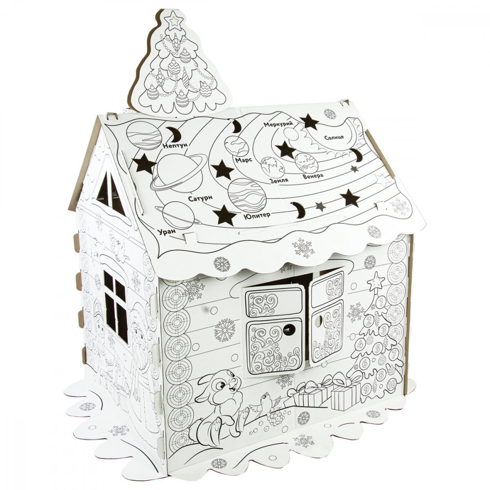 Домик-раскраска изготовлен из 100% безопасного, экологически чистого материала — гофрированного картона. Состоит из 7 деталей: 4 стен, крыши, трубы и флюгера, которые очень просто собираются и крепятся между собой без клея и ножниц. Все стороны домика разные по дизайну, а толстый контур у рисунков поможет малышу аккуратно их раскрасить любыми фломастерами, красками, карандашами, восковыми мелками. Полянка вокруг домика не даст испачкать ковер или пол красками.