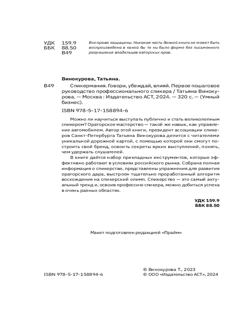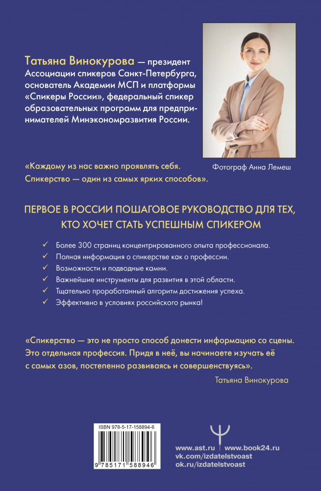 💳 Оплатить за товар можно при получении 🇰🇿 Есть бесплатная доставка по Казахстану от 1 дня 🎁 Копите бонусы с каждой покупки Серия: Умный бизнес Можно ли научиться выступать публично и стать великолепным спикером? Ораторское мастерство — такой же навык, как управление автомобилем. Автор этой книги, президент ассоциации спикеров Санкт-Петербурга Татьяна Винокурова делится с читателями уникальной дорожной картой, с помощью которой они смогут построить свой бренд, освоить секреты ярких выступлений, понять, чем удержать слушателей. В книге даётся набор прикладных инструментов, которые эффективно работают в условиях российского рынка. Собрана полная информация о спикерстве, представлены упражнения для развития ораторского дара, выстроен тщательно проработанный алгоритм восхождения на спикерский олимп. Спикерство — это самый актуальный тренд и, освоив профессию спикера, можно добиться успеха в очень разных областях. |