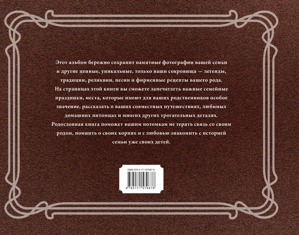 💳 Оплатить за товар можно при получении 🇰🇿 Есть бесплатная доставка по Казахстану 🎁 Копите бонусы с каждой покупки Серия: Памятный подарок Этот альбом бережно сохранит памятные фотографии вашей семьи и другие ценные, уникальные, только ваши сокровища — легенды, традиции, реликвии, песни и фирменные рецепты вашего рода. На страницах этой книги вы сможете запечатлеть важные семейные праздники, места, которые имеют для ваших родственников особое значение, рассказать о ваших совместных путешествиях, любимых домашних питомцах и многих других трогательных деталях. Родословная книга поможет вашим потомкам не терять связь со своим родом, помнить о своих корнях и с любовью знакомить с историей семьи уже своих детей. |