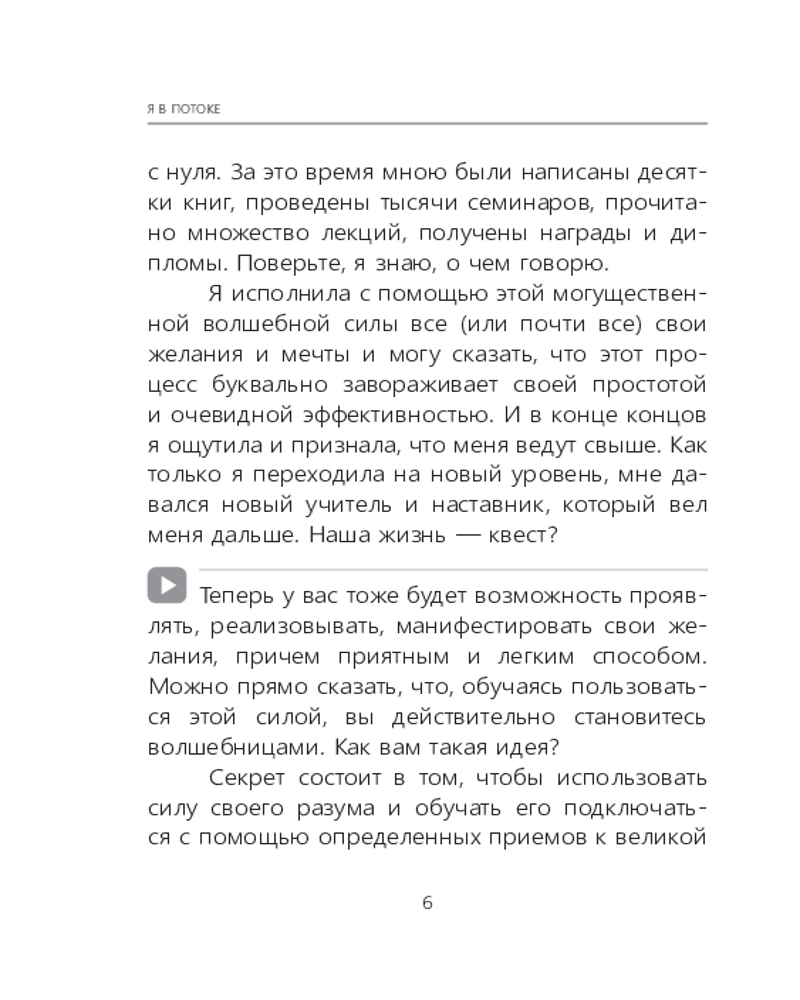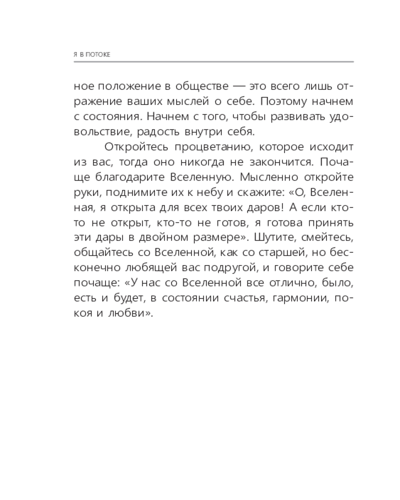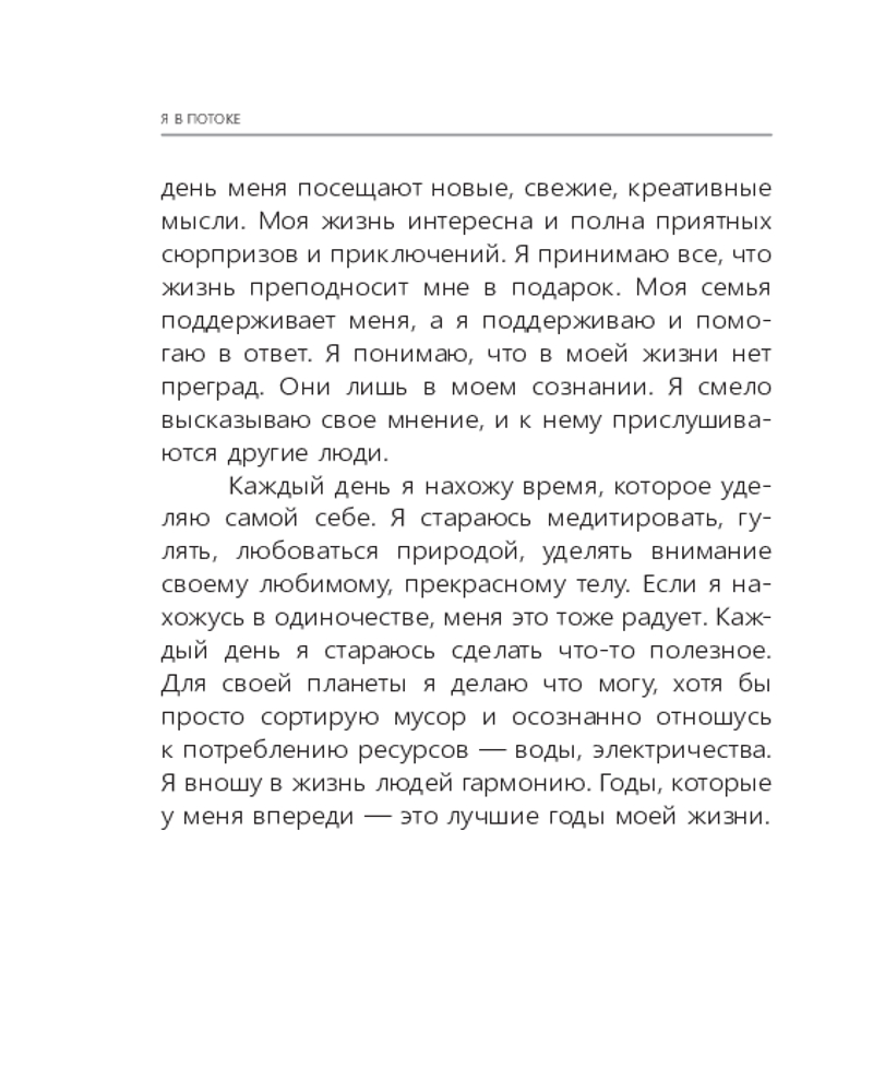 В авторском сборнике «Я в потоке. Медитации и энергопрактики для исполнения желаний» собраны медитации об успехе, любви, изобилии и радости, о том, как достичь всего, о чем мечтаете. Самое главное — это понимание того, что все наши цели достижимы, и мы сами можем сделать жизнь такой, какой пожелаем. Вы узнаете, как медитации помогают изменить свое сознание и подсознание, и позволяют встать на путь счастливой жизни. Прочитав книгу и прослушав авторские медитации Наталии, вы убедитесь, что чудеса станут действительно нормой вашей жизни! Книгу дополняет аудиоприложение с избранными медитациями и практиками, записанными голосом автора! Прочитав книгу и прослушав авторские медитации, вы убедитесь, что чудеса станут действительно нормой вашей жизни!