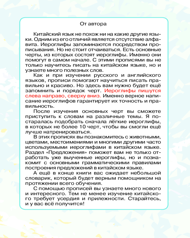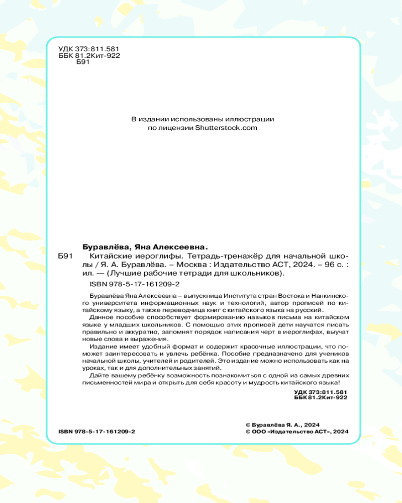 💳 Оплатить за товар можно при получении 🇰🇿 Есть бесплатная доставка по Казахстану от 1 дня 🎁 Копите бонусы с каждой покупки Серия: Лучшие рабочие тетради для школьников Буравлёва Яна Алексеевна — выпускница Института стран Востока и Нанкинского университета информационных наук и технологий, автор прописей по китайскому языку, а также переводчица книг с китайского языка на русский. |