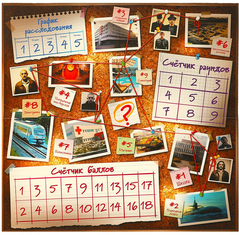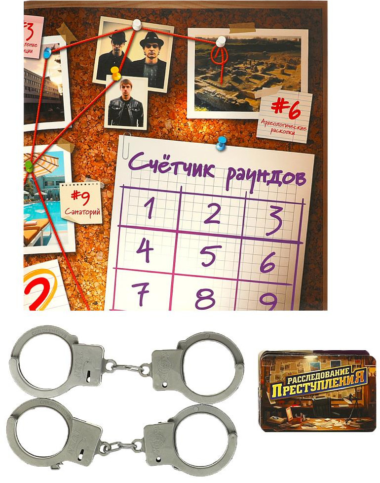 В детективной настольной игре «Расследование преступления» вам предстоит раскрыть преступников, которые прячутся среди вас! Отправляйтесь на задания и постарайтесь вычислить, кто из вас – преступник, который, в отличие от детективов, не знает, в какой локации он оказался. Игроки ограничены пятью игровыми днями – это значит, что каждый из вас сможет задать только пять вопросов, которые помогут вычислить, кто из участников детектив, а кто – злоумышленник. Выиграют только хитрейшие! В комплект игры входят 2 пары наручников, которые помогут задержать преступников.