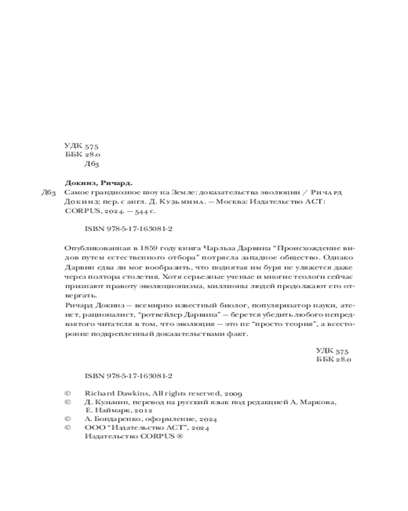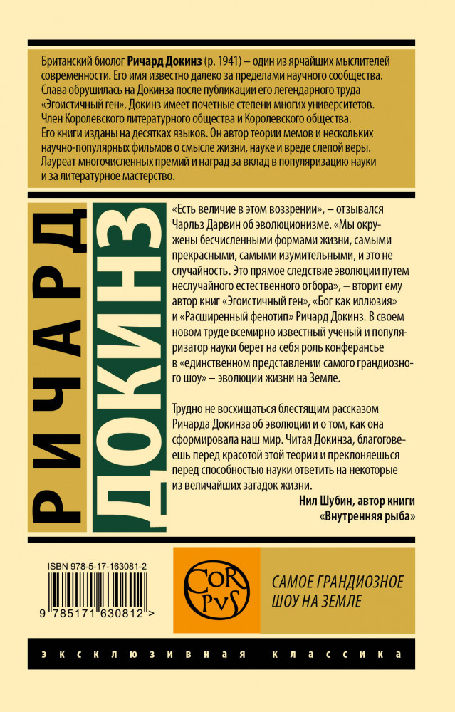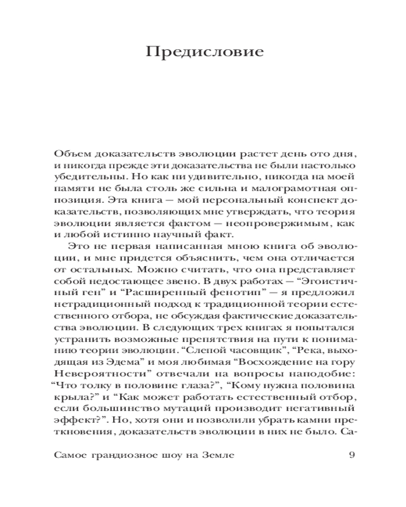 Ричард Докинз — всемирно известный биолог, популяризатор науки, атеист, рационалист, «ротвейлер Дарвина» — берется убедить любого непредвзятого читателя в том, что эволюция — это не «просто теория», а всесторонне подкрепленный доказательствами факт. |