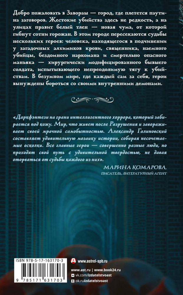 💳 Оплатить за товар можно при получении 🇰🇿 Есть бесплатная доставка по Казахстану от 1 дня 🎁 Копите бонусы с каждой покупки Серия: Дети великого шторма Добро пожаловать в Завораш — город, где плетется паутина заговоров. Жестокие убийства здесь не редкость, а на улицах правит белый тлен — новая чума, от которой гибнут сотни горожан. В этом городе пересекаются судьбы нескольких героев: человека, находящегося в подчинении у загадочных алхимиков крови, священника, наемного убийцы, бездомного наркомана и смертельно опасного маньяка — хирургически модифицированного бывшего солдата, испытывающего непреодолимую тягу к убийствам. В безумном мире, где каждый сам за себя, герои вынуждены бороться со своими внутренними демонами. |