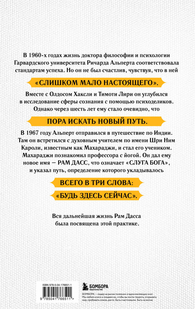 💳 Оплатить за товар можно при получении 🇰🇿 Есть бесплатная доставка по Казахстану от 1 дня 🎁 Копите бонусы с каждой покупки Серия: Великие учителя современности Культовая книга, когда-то открывшая западному миру философию и мировоззрение Востока. В 1960-х годах жизнь доктора философии и психологии Гарвардского университета Ричарда Альперта соответствовала всем стандартам успеха. Но он не был счастлив, чувствуя, что в ней «слишком мало настоящего». В 1967 году Альперт уволился из университета и отправился в путешествие по Индии. Там он встретил духовного учителя по имени Шри Ним Кароли Баба, известного как Махараджи, и стал его учеником, получив имя Рам Дасс, что значит «Слуга Бога». |