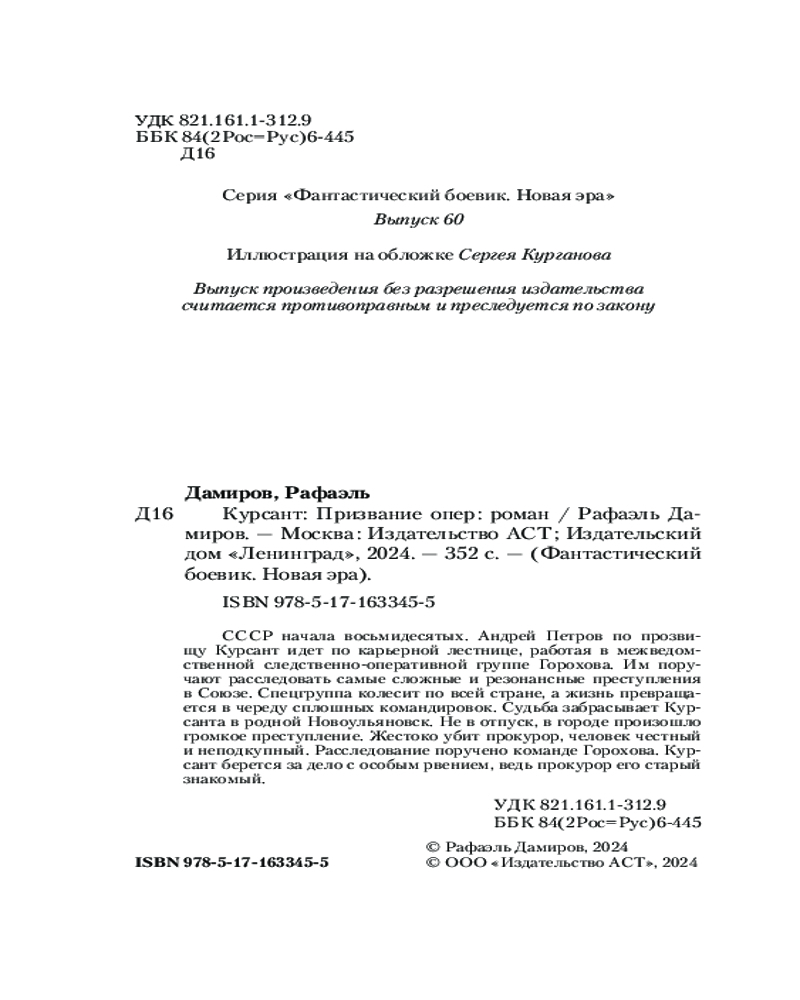 💳 Оплатить за товар можно при получении 🇰🇿 Есть бесплатная доставка по Казахстану от 1 дня 🎁 Копите бонусы с каждой покупки Серия: Фантастический боевик. Новая эра СССР начала восьмидесятых. Андрей Петров по прозвищу Курсант идет по карьерной лестнице, работая в межведомственной следственно-оперативной группе Горохова. Им поручают расследовать самые сложные и резонансные преступления в Союзе. Спецгруппа колесит по всей стране, а жизнь превращается в череду сплошных командировок. Судьба забрасывает Курсанта в родной Новоульяновск. Не в отпуск, в городе произошло громкое преступление. Жестоко убит прокурор, человек честный и неподкупный. Расследование поручено команде Горохова. Курсант берется за дело с особым рвением, ведь прокурор его старый знакомый. |