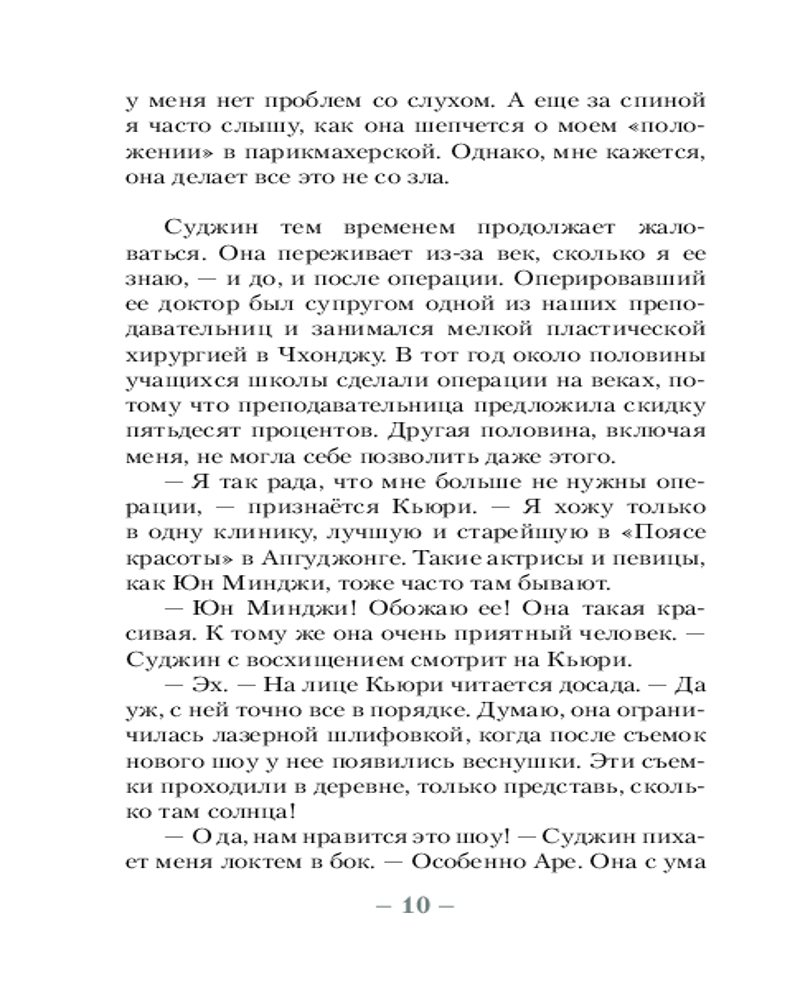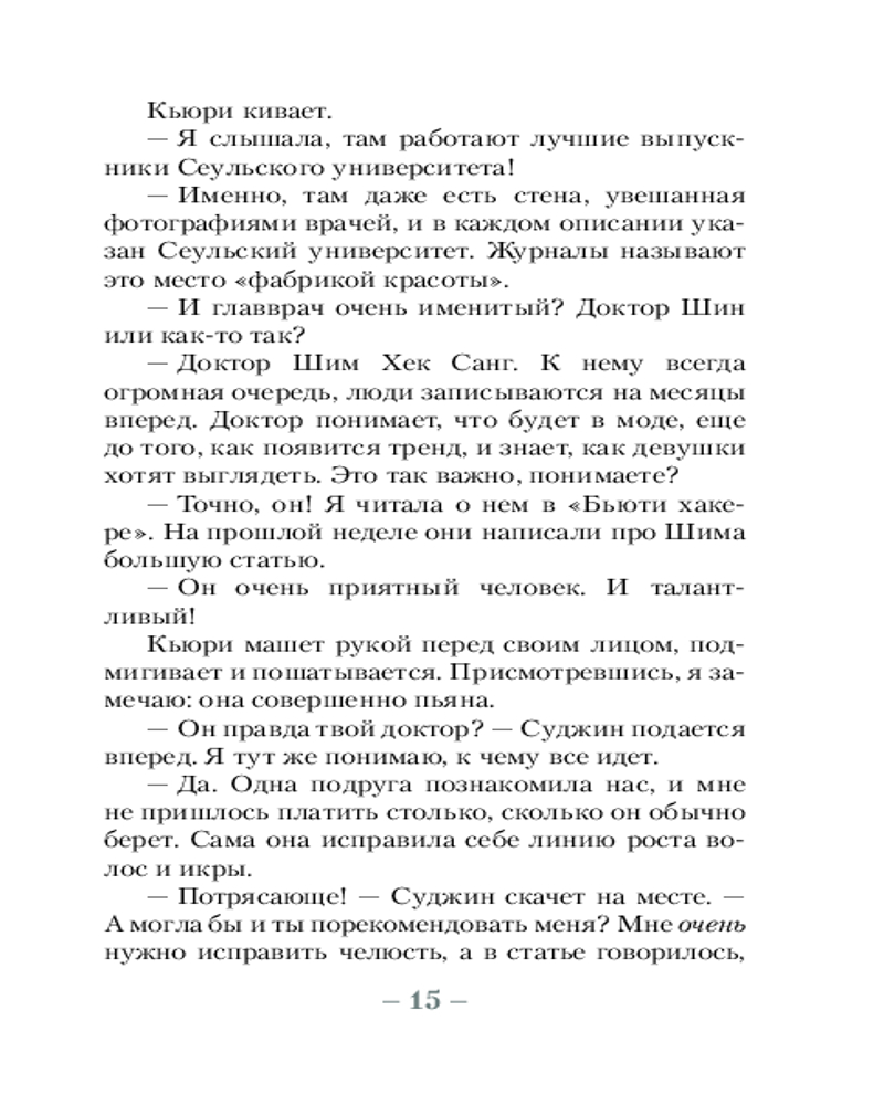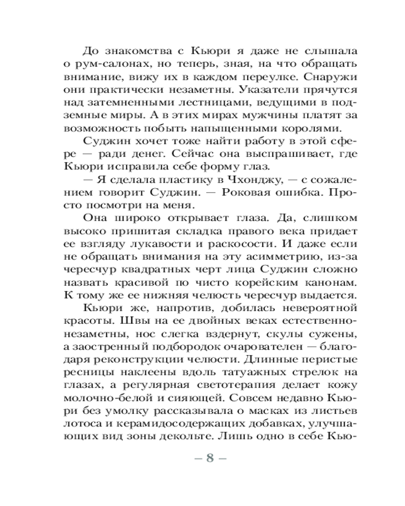 💳 Оплатить за товар можно при получении 🇰🇿 Есть бесплатная доставка по Казахстану от 1 дня 🎁 Копите бонусы с каждой покупки Серия: Верю в любовь Пять девушек. Пять тяжелых судеб. Один офистель. Эту комнату снимает Кьюри. Она работает в рум-салоне — так в Южной Корее скромно называют клубы, где мужчины из высших кругов могут выпить в приятной компании красивых девушек, а потом, возможно, продолжить с ними вечер в гостиничном номере. Однажды сделав пластическую операцию, Кьюри больше не может остановиться. Если ты некрасива в этой стране, у тебя просто-напросто нет будущего. Соседка Кьюри, талантливая художница Михо, выросла в приюте, но выиграла стипендию и уехала изучать искусство в Нью-Йорк. Она влюблена в обаятельного наследника одной из крупнейших корпораций страны. Но разве не очевидно, что он пользуется ее слепой влюбленностью?.. В комнате в конце коридора живет Ара, парикмахер,одержимая k-pop-айдолом. Разве он — не самый идеальный парень на свете? А ее лучшая подруга Суджин одержима мечтой о пластической операции, которая, конечно же, изменит ее жизнь. Вонна, этажом ниже, отчаянно хочет родить ребенка, но понятия не имеет, как его растить на жалкую зарплату ее мужа... |