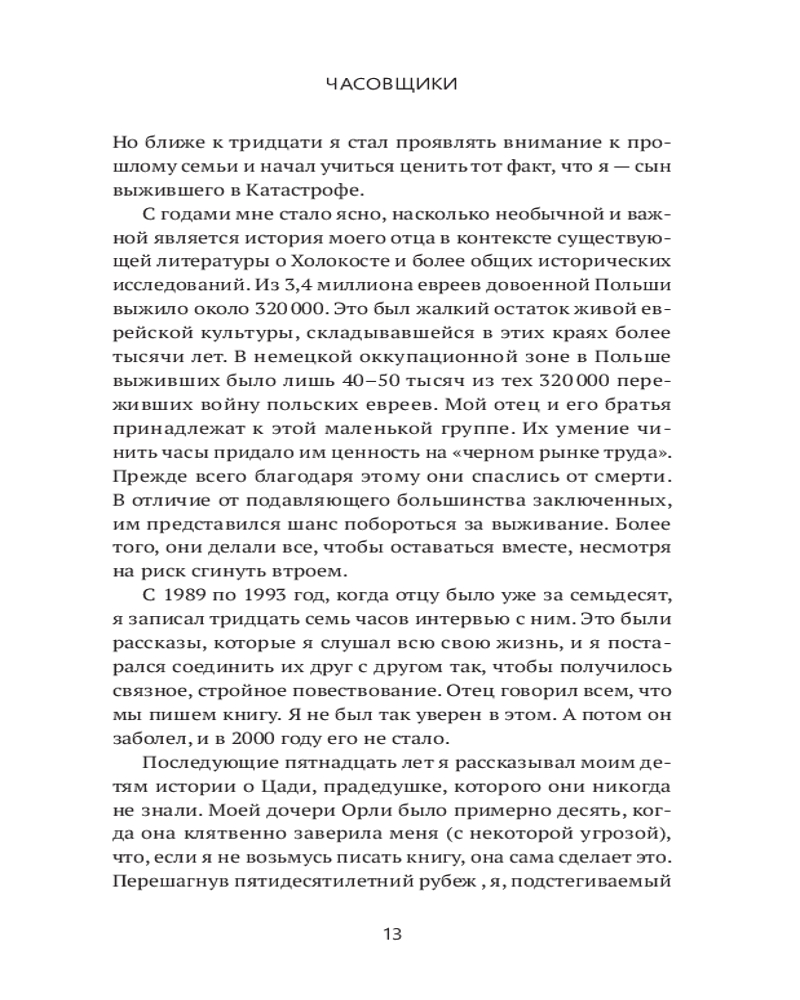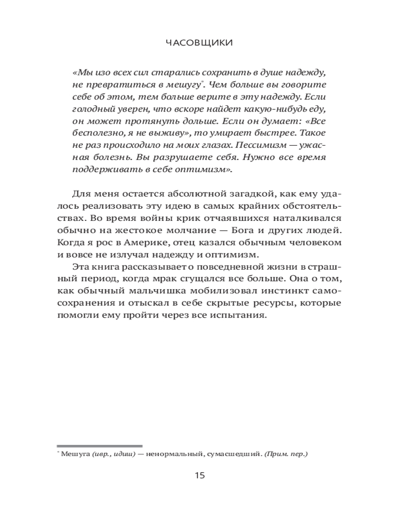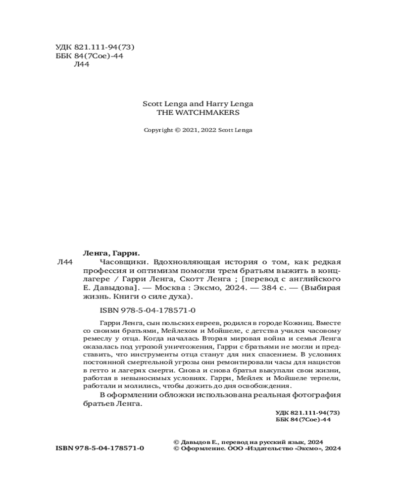 Часовщики. Вдохновляющая история о том, как редкая профессия и оптимизм помогли трем братьям выжить в концлагереВ данный момент этот товар отсутствует в продаже. Возможно, у нас найдется аналогичный или похожий товар здесь. Серия: Выбирая жизнь. Книги о силе духа История жизни трех братьев-часовщиков, их обучения ремеслу в мастерской отца, тяжелых испытаниях и воодушевляющих моментах до, во время и после Второй мировой войны. Выживание в гетто и лагерях благодаря уникальной профессии. Мужество и взаимовыручка в нечеловеческих условиях. Трогательное описание братства и отцовства. Признание важности семьи и веры. Уникальный рассказ о том, как важно успеть рассказать детям историю своей жизни. Книга основана на десятилетних интервью Скотта Ленга со своим отцом Гарри. Книга дополнена фотографиями, документами и картами времен Второй мировой войны. |